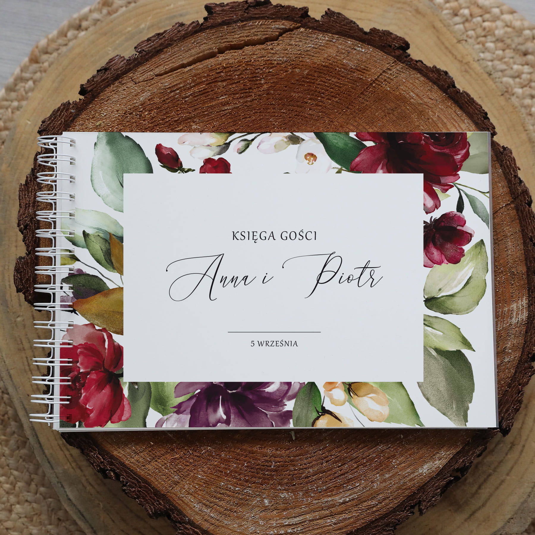 Księga gości klasyczna lub z ankietami - wzór z bordowymi kwiatami boho