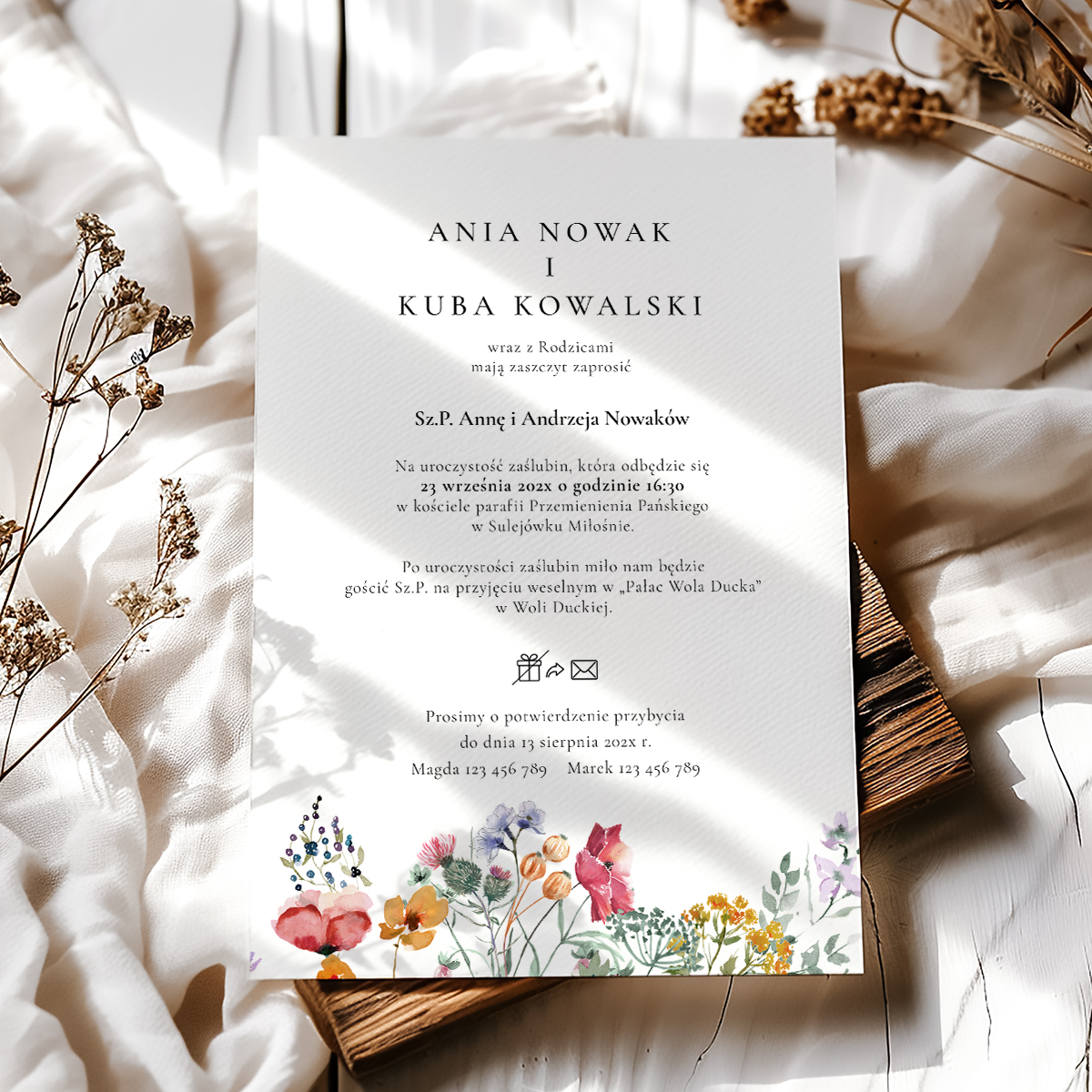 Dołącz do zamówienia treść zaproszenia uzupełnioną o wasze dane, miejsce ślubu i przyjęcia, telefonami z imionami do potwierdzenia, oraz wybrane cytaty i rebusy.
