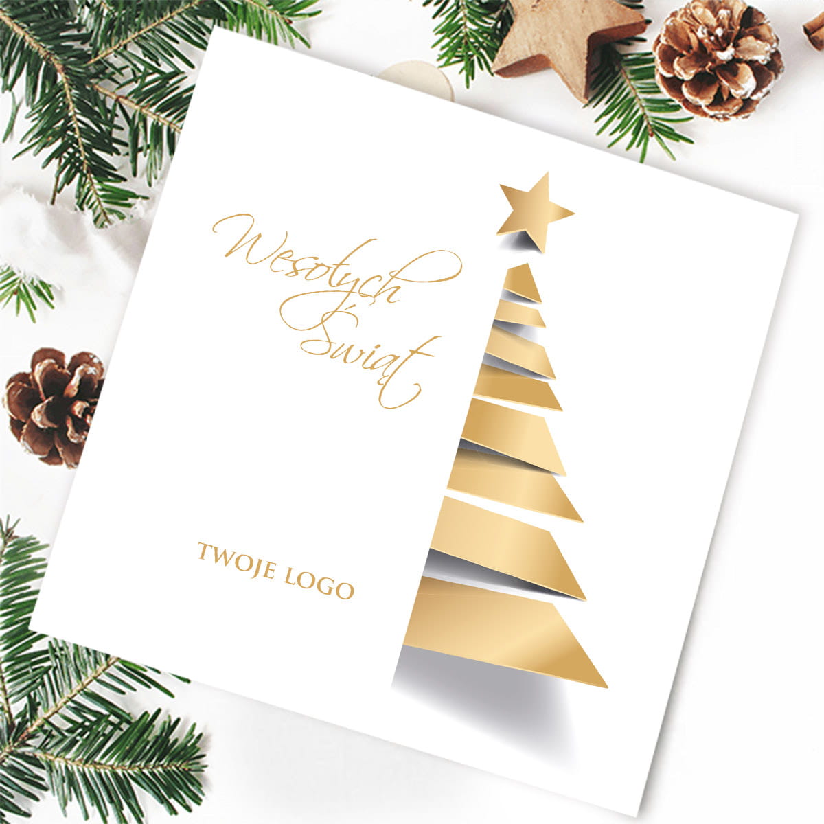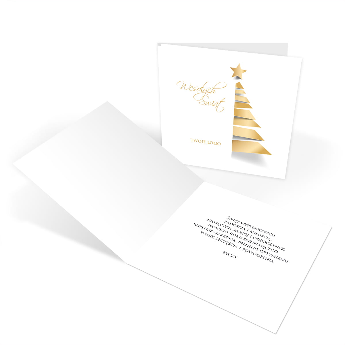 Kartki świąteczno-noworoczne dla firm - wzór ze złotą choinką na białym tle.