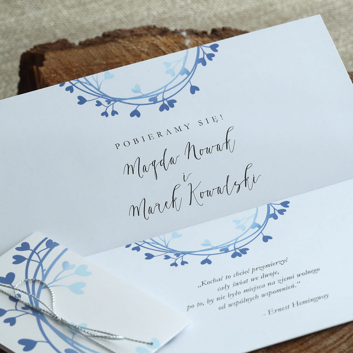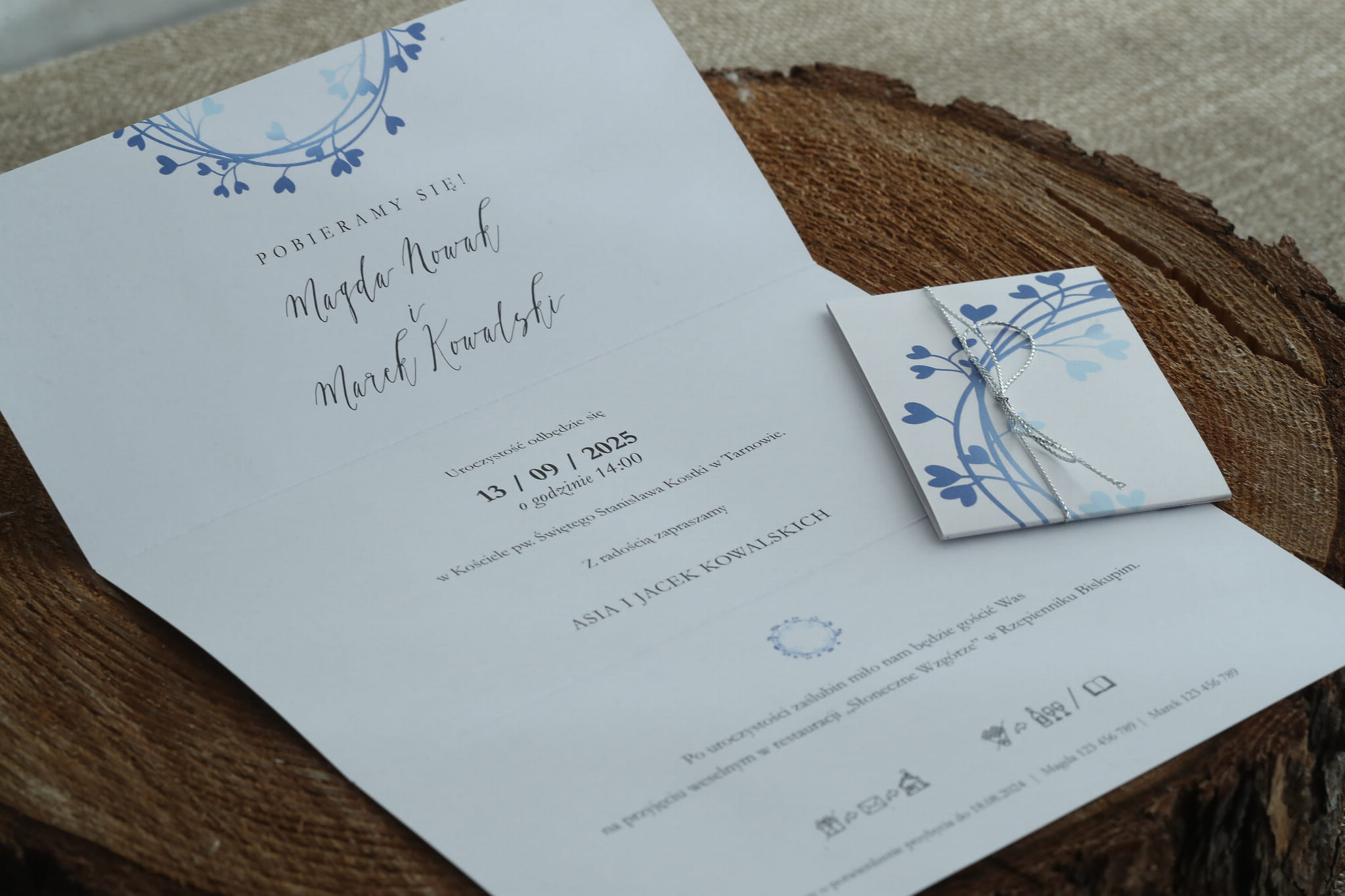 Dołącz do zamówienia treść zaproszenia uzupełnioną o wasze dane, miejsce ślubu i przyjęcia, telefonami z imionami do potwierdzenia, oraz wybrane cytaty i rebusy.