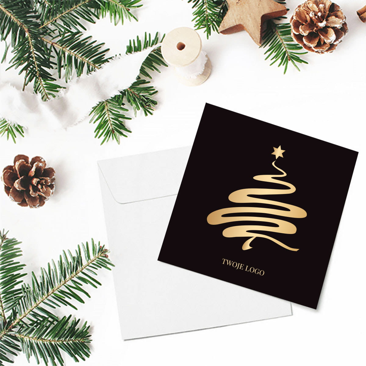 Czarne kartki firmowe na Boże Narodzenie ze złotą choinką - 14,5x14,5 cm