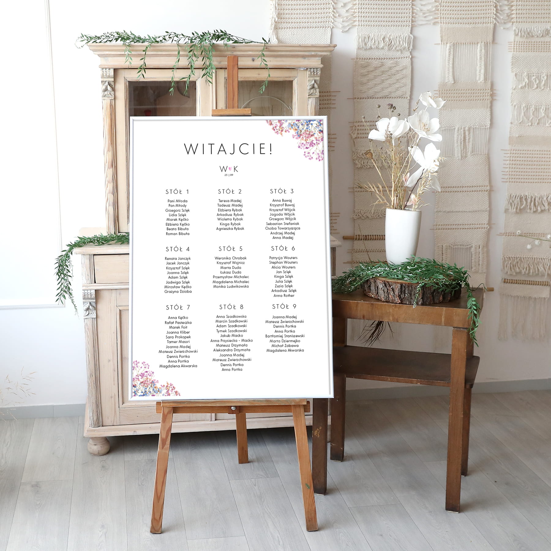 Plan rozmieszczenia stołów i gości - kolorowa gipsówka