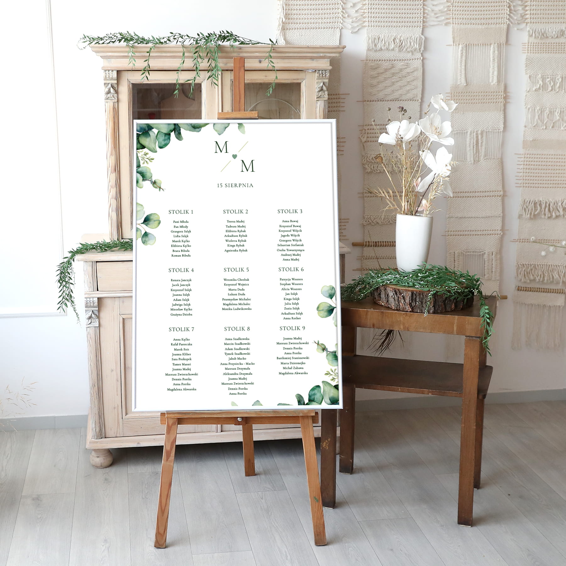 Plan rozmieszczenia stołów i gości - z liśćmi eukaliptusa