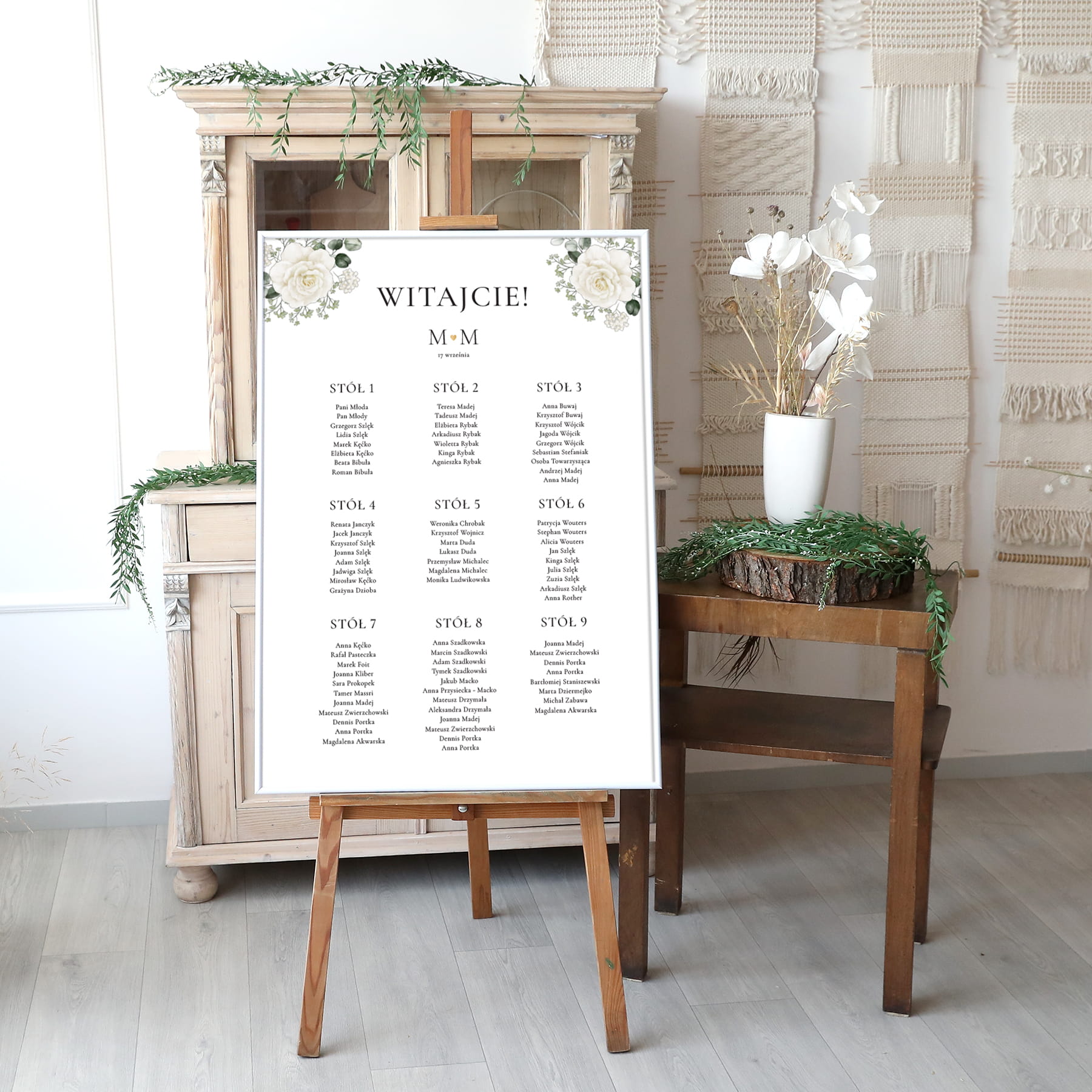 W Studio Brzoza zapełnimy gustownie i pomysłowo udekorowaną listą stołów z przypisanymi miejscami.