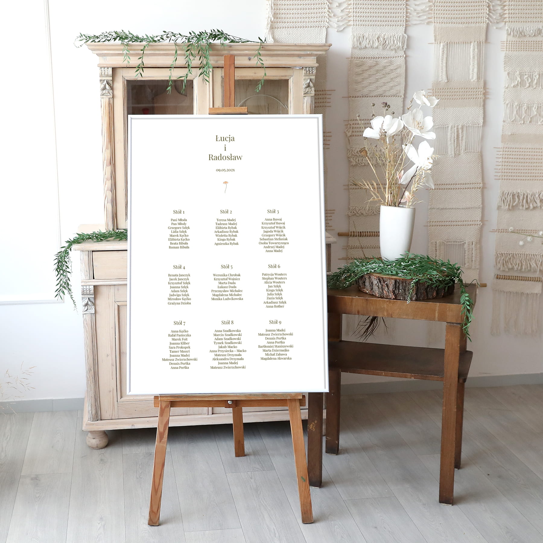 W Studio Brzoza zapełnimy gustownie i pomysłowo udekorowaną listą stołów z przypisanymi miejscami.