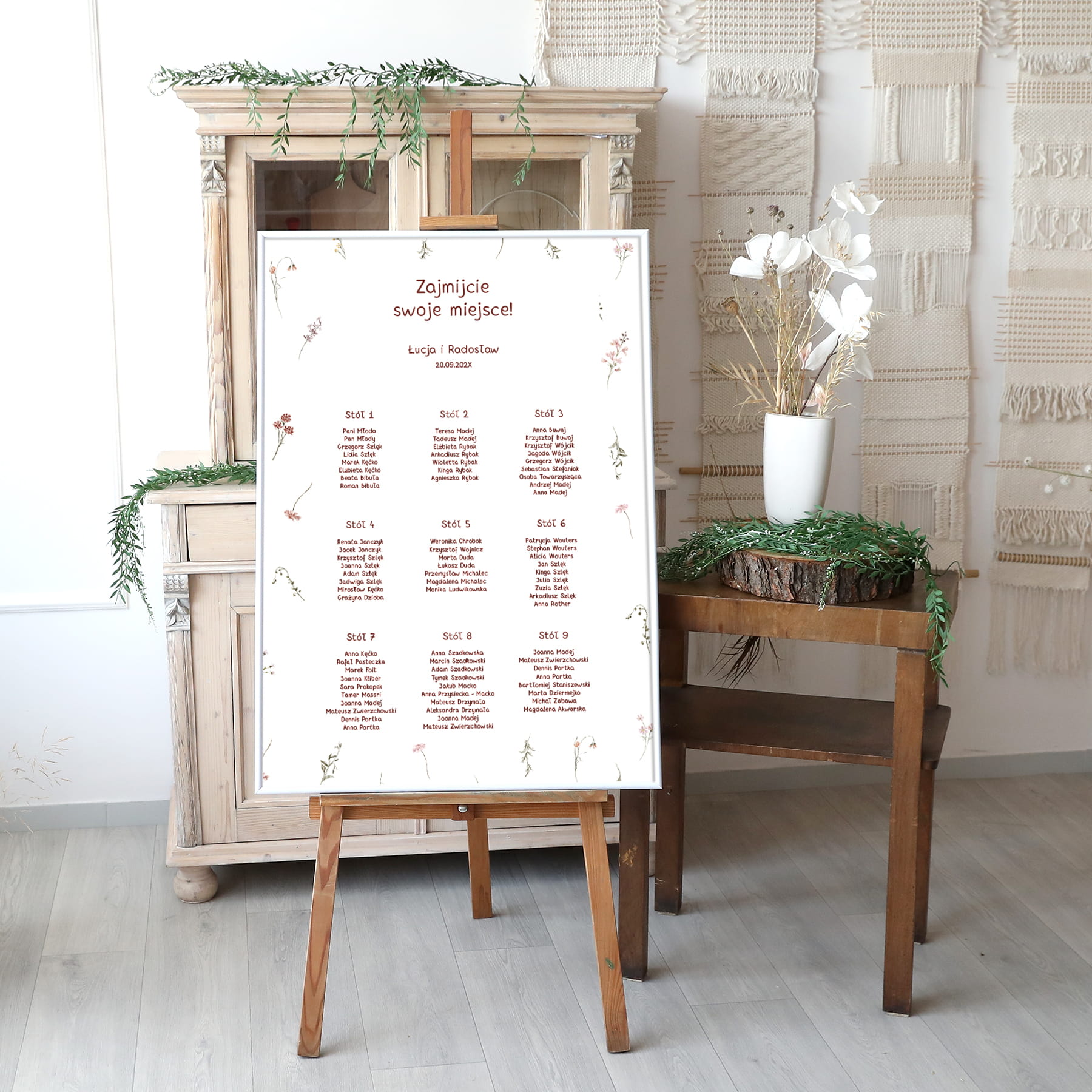 Plan rozmieszczenia stołów i gości - z rustykalnymi polnymi kwiatami