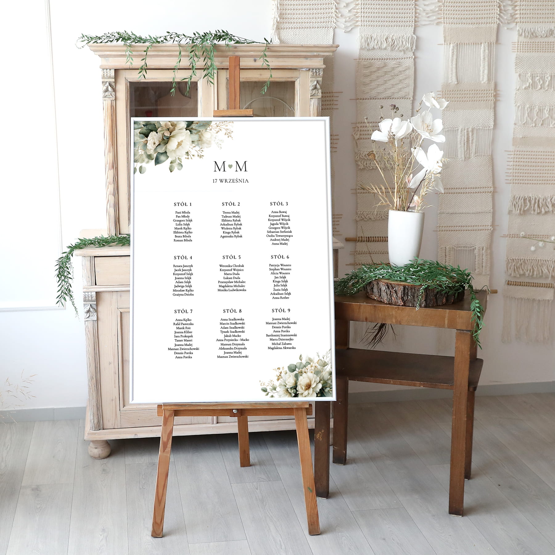 W Studio Brzoza zapełnimy gustownie i pomysłowo udekorowaną listą stołów z przypisanymi miejscami.