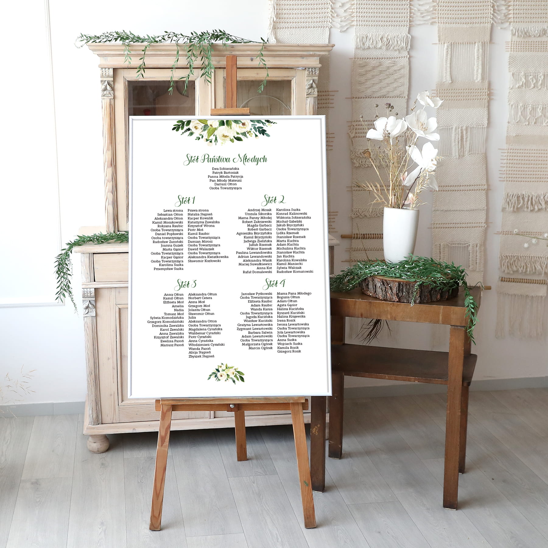 Postawiona przy wejściu tablica z rozmieszczeniem gości ułatwi weselnikom odnalezienie swojego miejsca na sali,