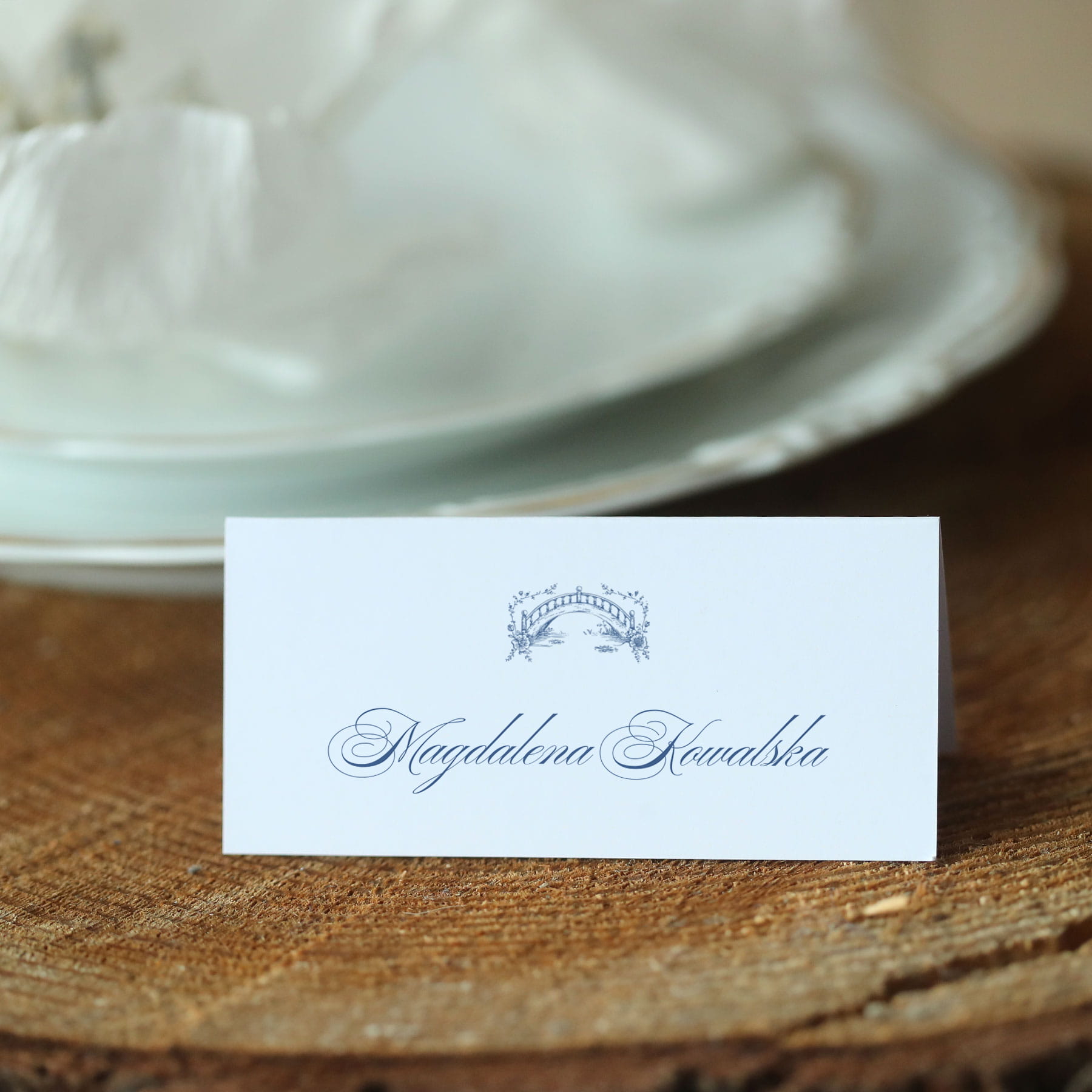 Piękne winietki na Twój stół z niebieskim rysunkiem stylizowanego mostu