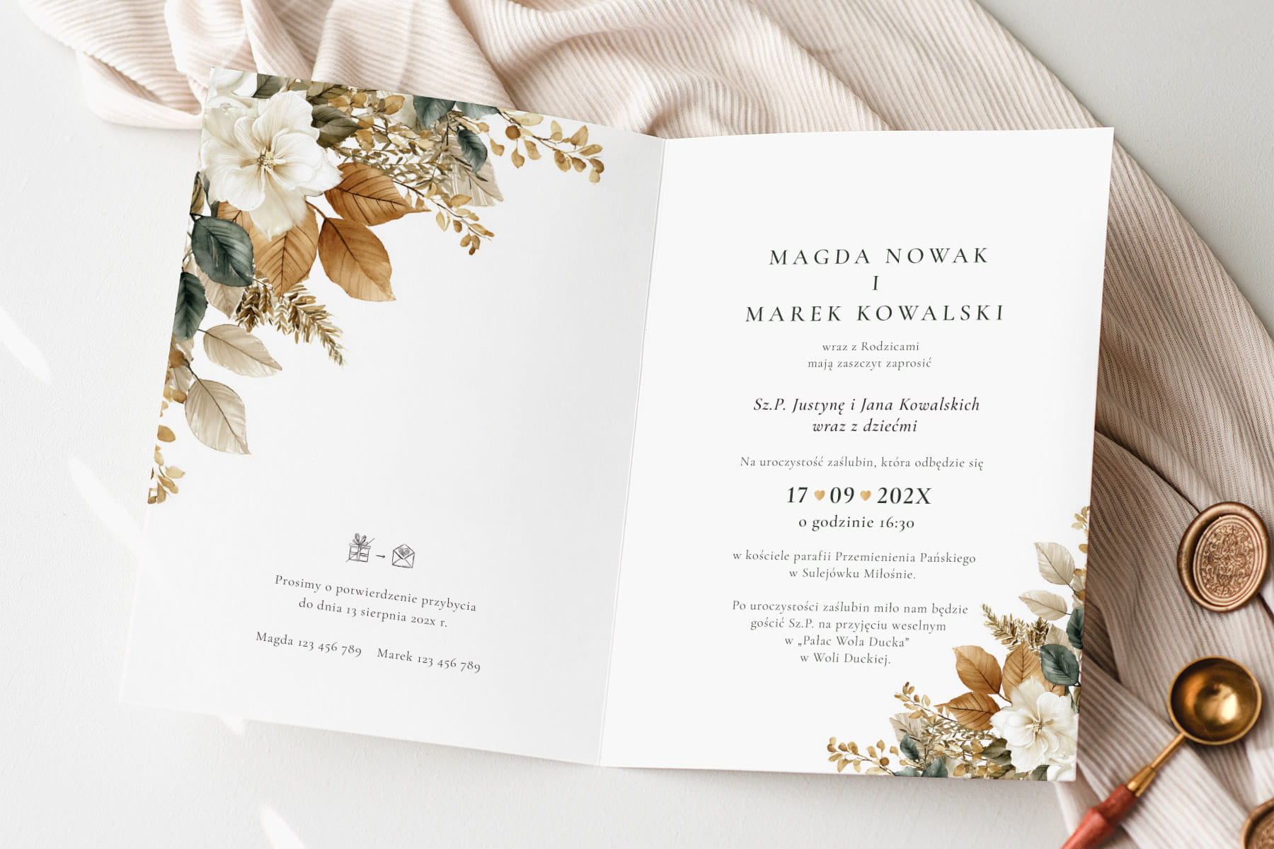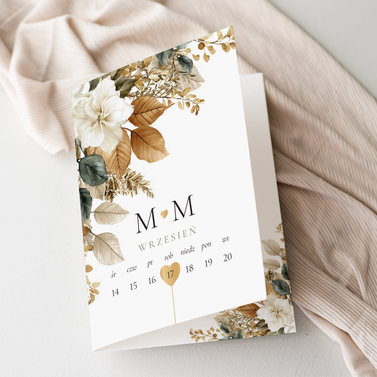 Jesienny Blask – Rustykalne Zaproszenia Ślubne z Kalendarzem i Złotymi Liśćmi - 12x17 rozkładane