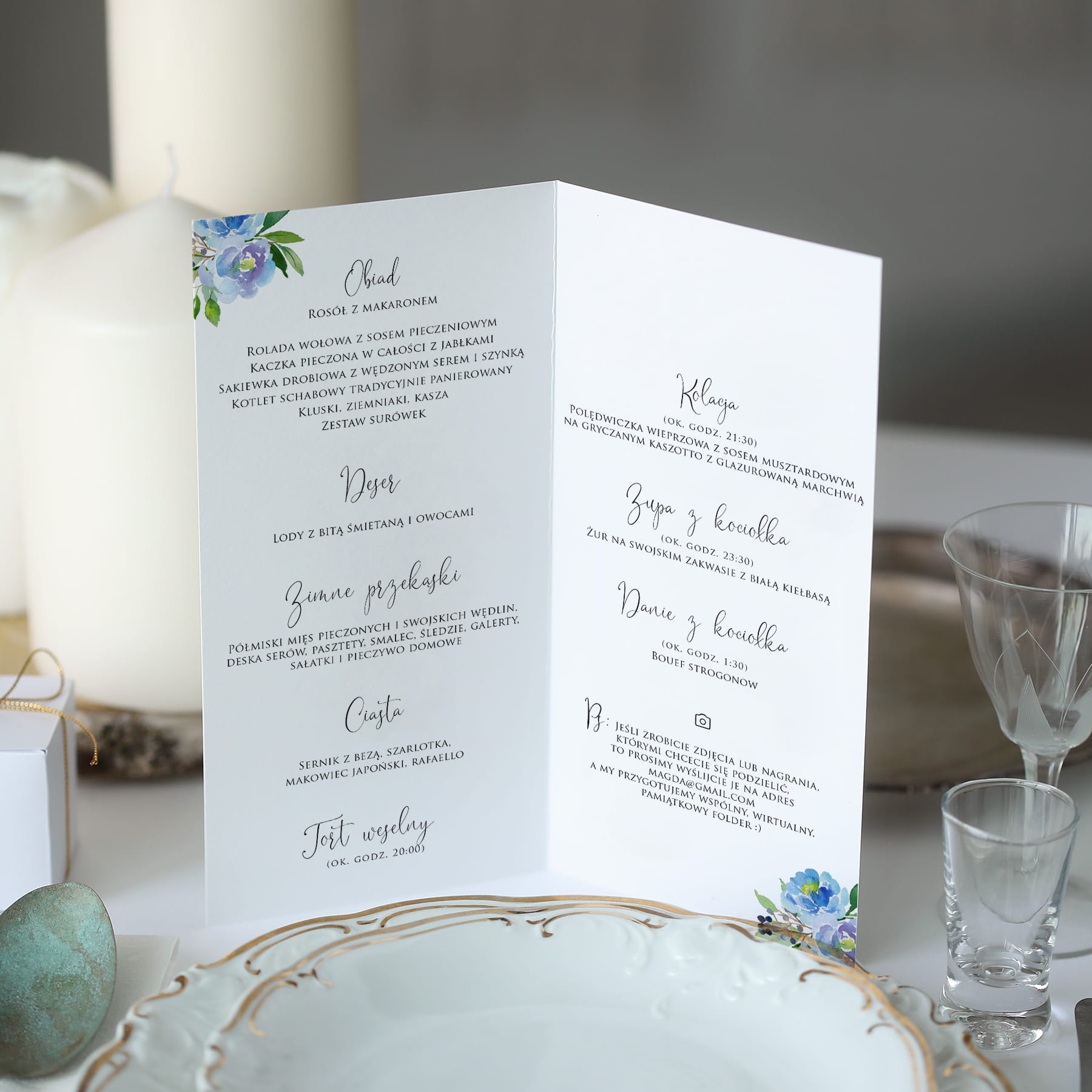 Karta menu lub harmonogram z niebieskimi kwiatami