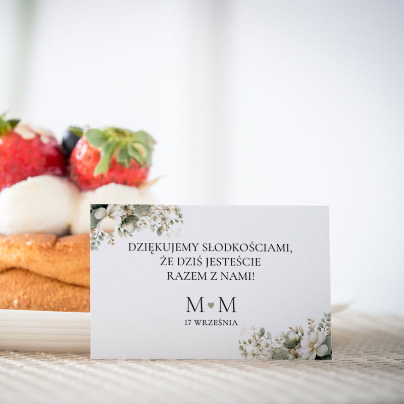 Karteczki do ciasta weselnego z kompozycją z eukaliptusa