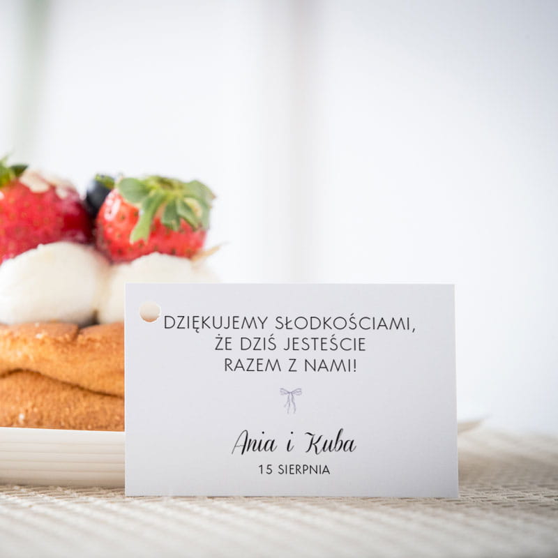 Karteczki do ciasta weselnego z liliową wstążką
