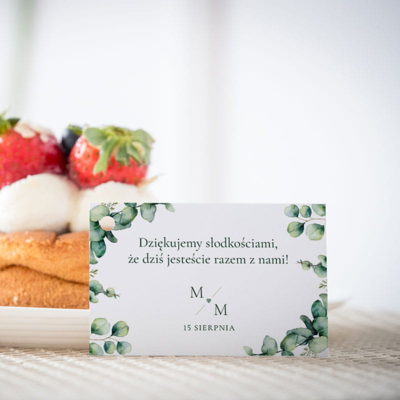Karteczki do ciasta weselnego z liśćmi eukaliptusa