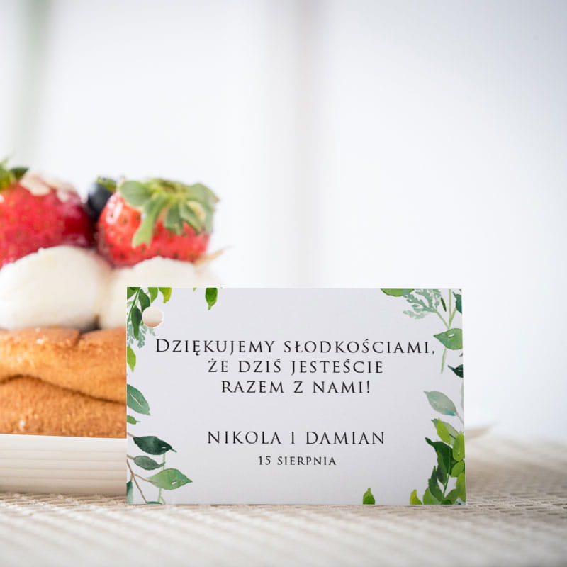 Karteczki do ciasta weselnego z zielonymi listkami