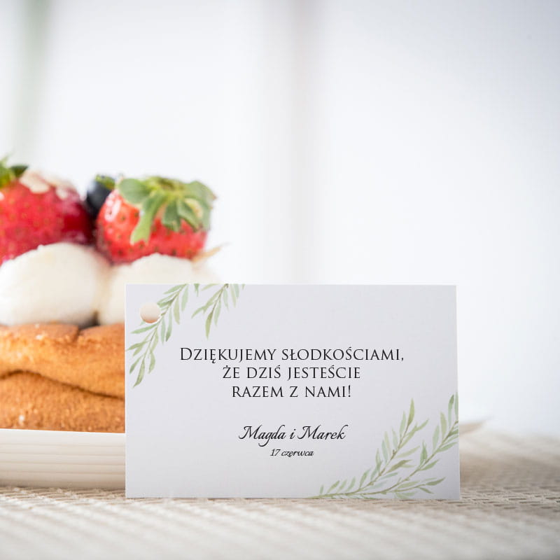 Bileciki do ciasta weselnego z delikatnymi gałązkami.
