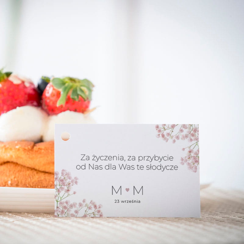 Bileciki do ciasta weselnego z różową gipsówką.