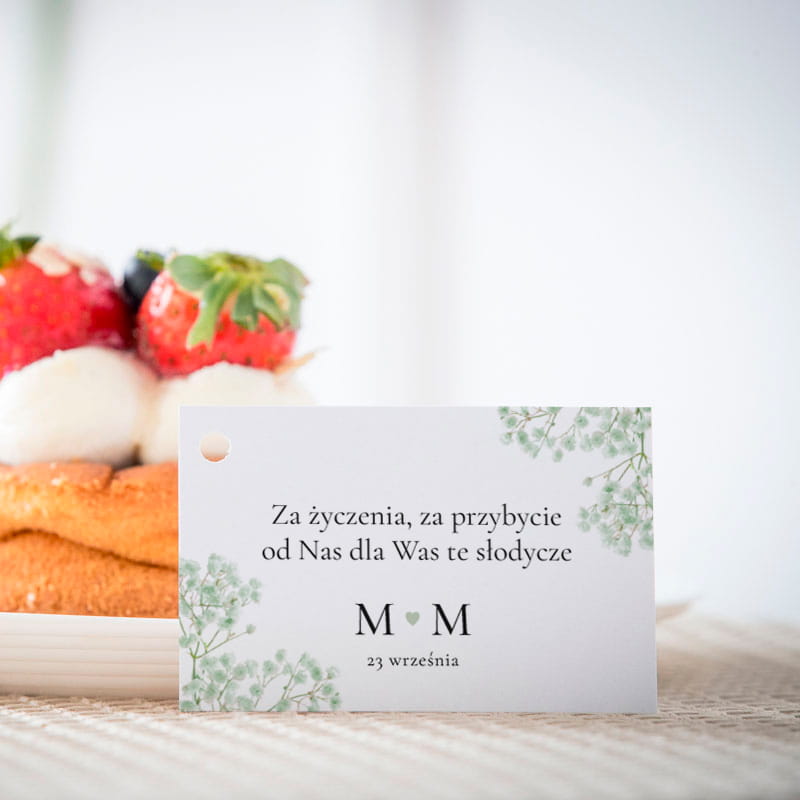 Bileciki do ciasta weselnego z zieloną gipsówką.