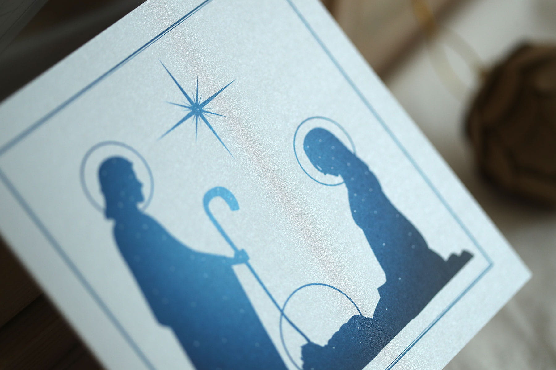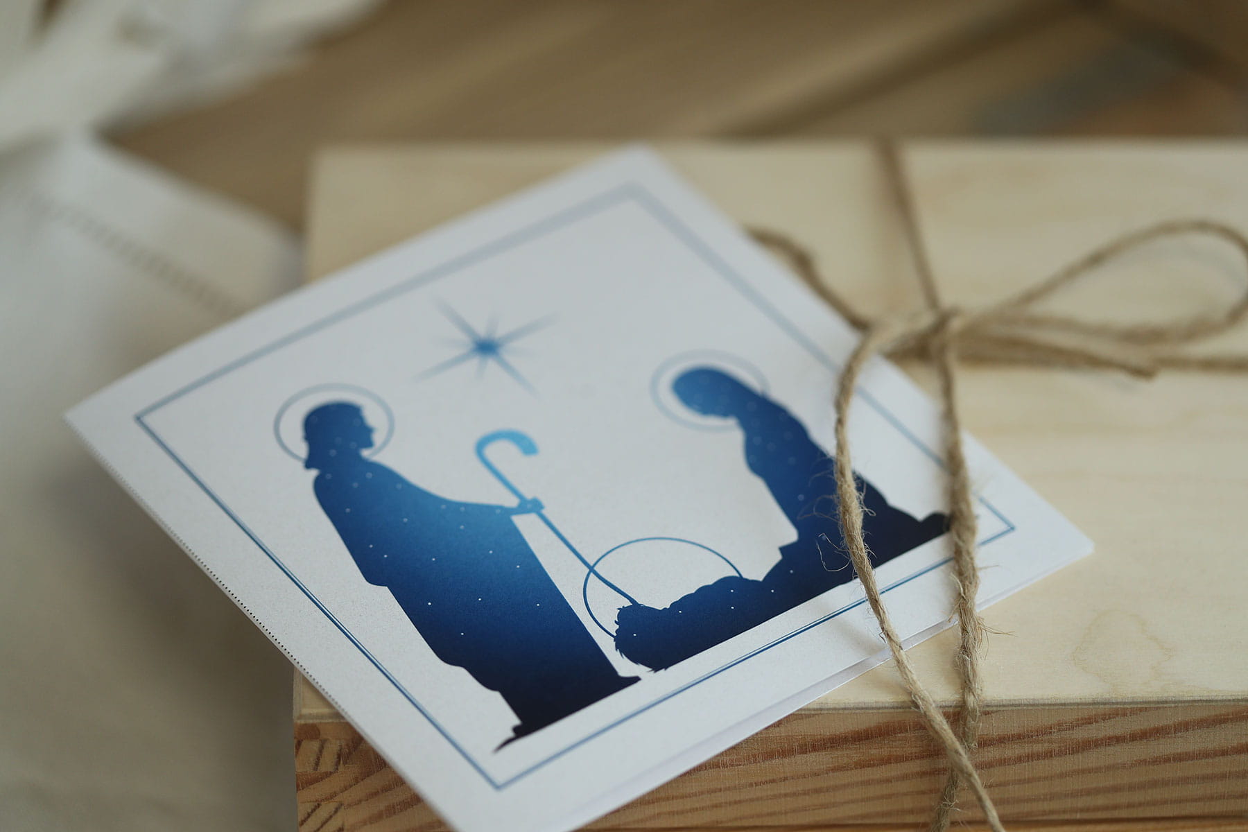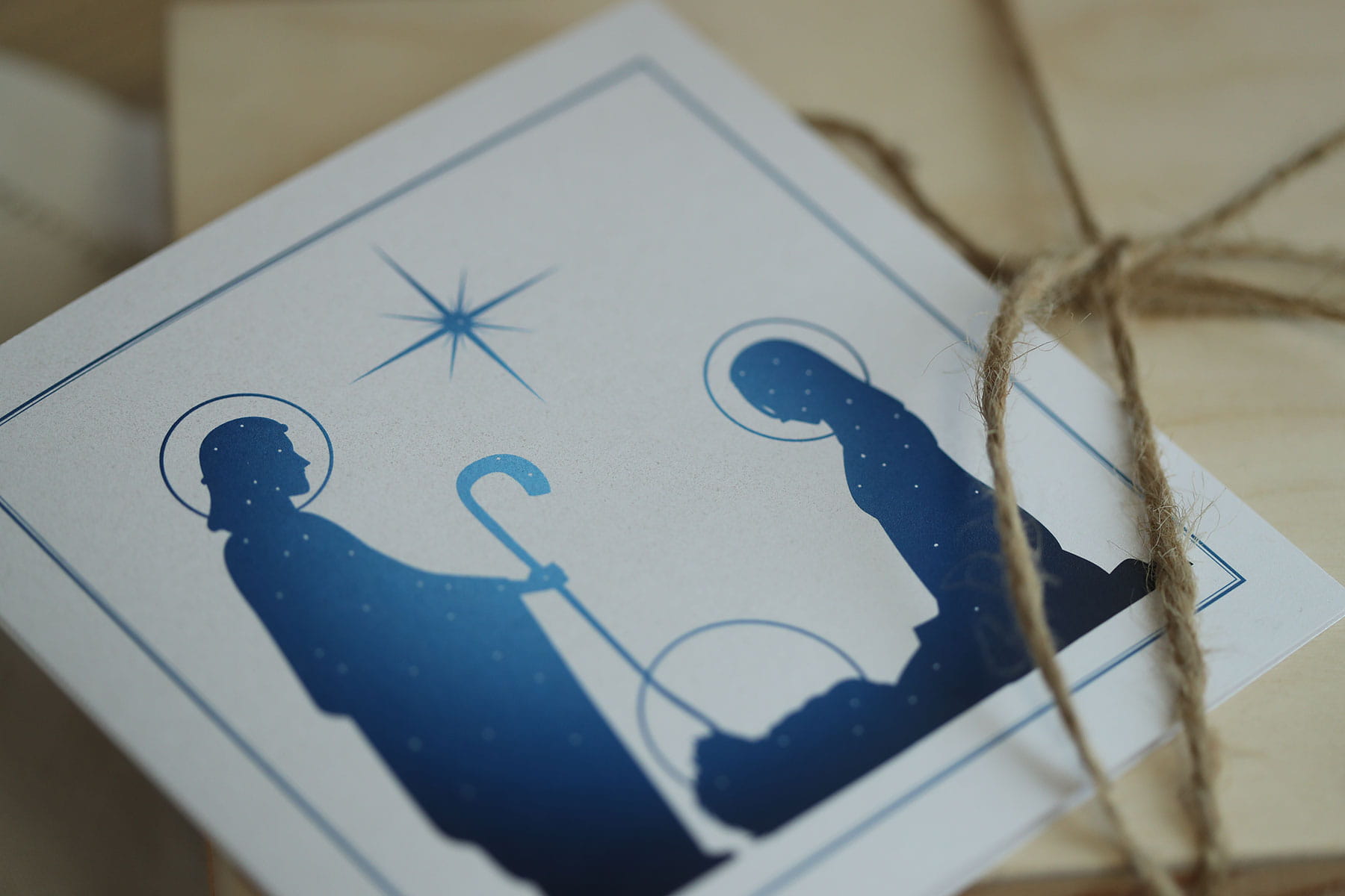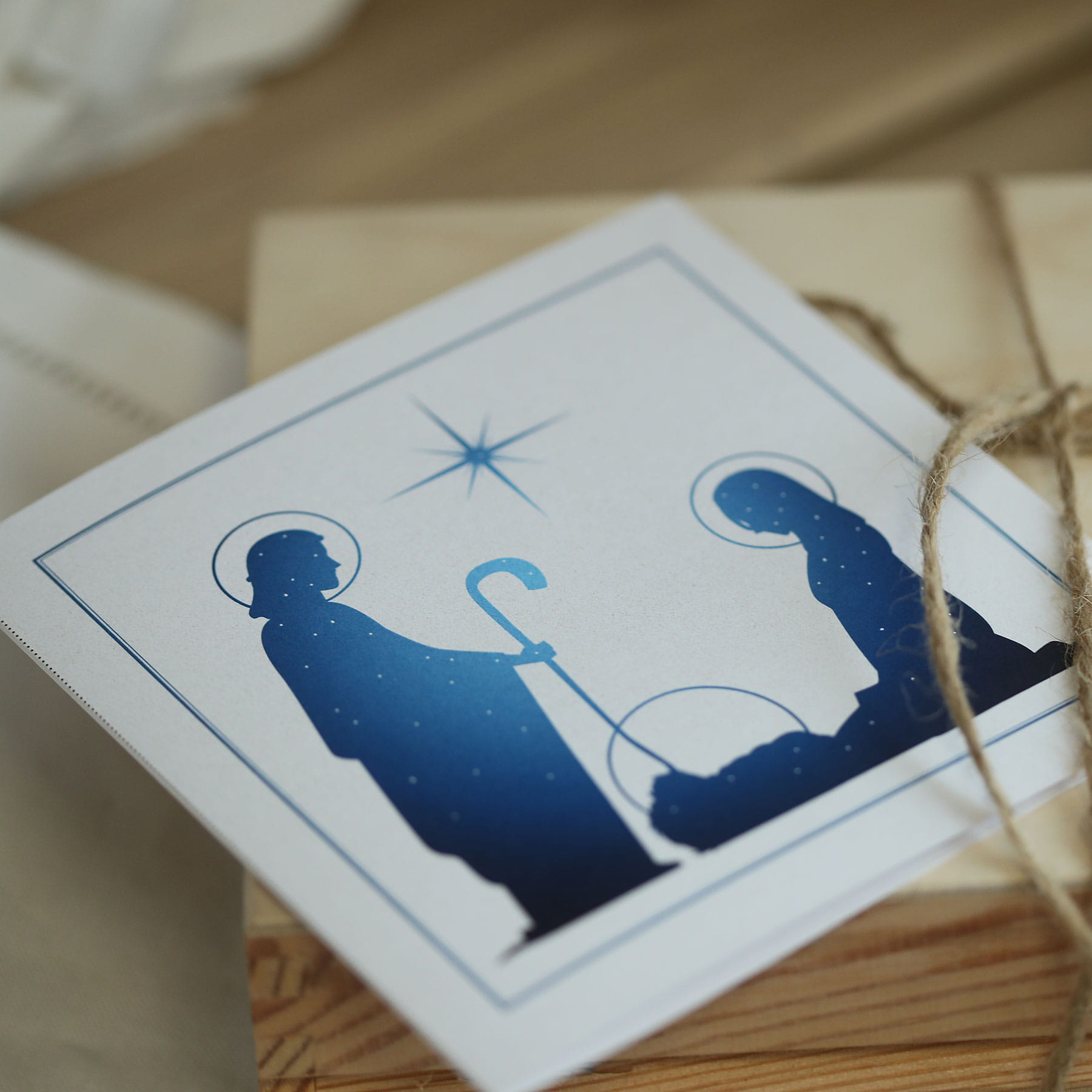 Minimalistyczna kartka świąteczna z nowoczesną szopką w spokojnych odcieniach niebieskiego i błękitu emanuje elegancją i prostotą.
