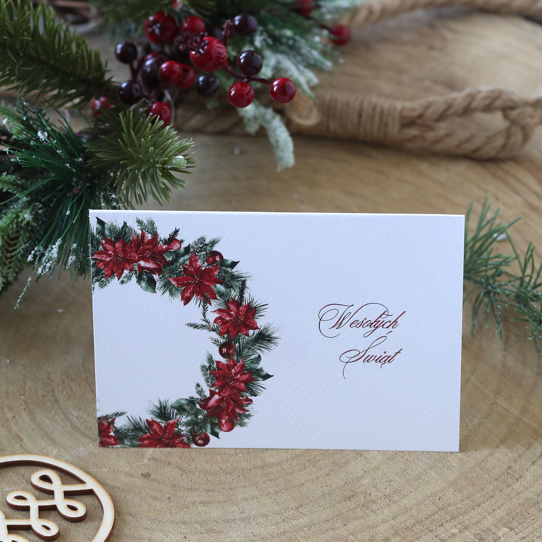Kartki świąteczno-noworoczne dla firm - klasyczny wzór z świątecznym wieńcem.