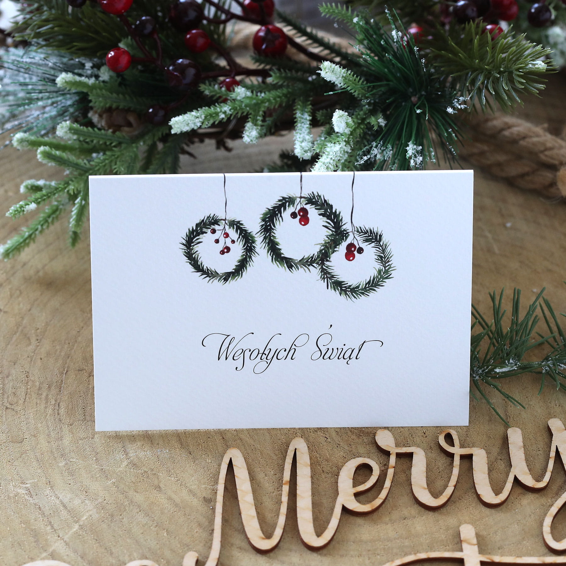 Kartki świąteczno-noworoczne dla firm - klasyczny wzór z jodłowymi wianuszkami.