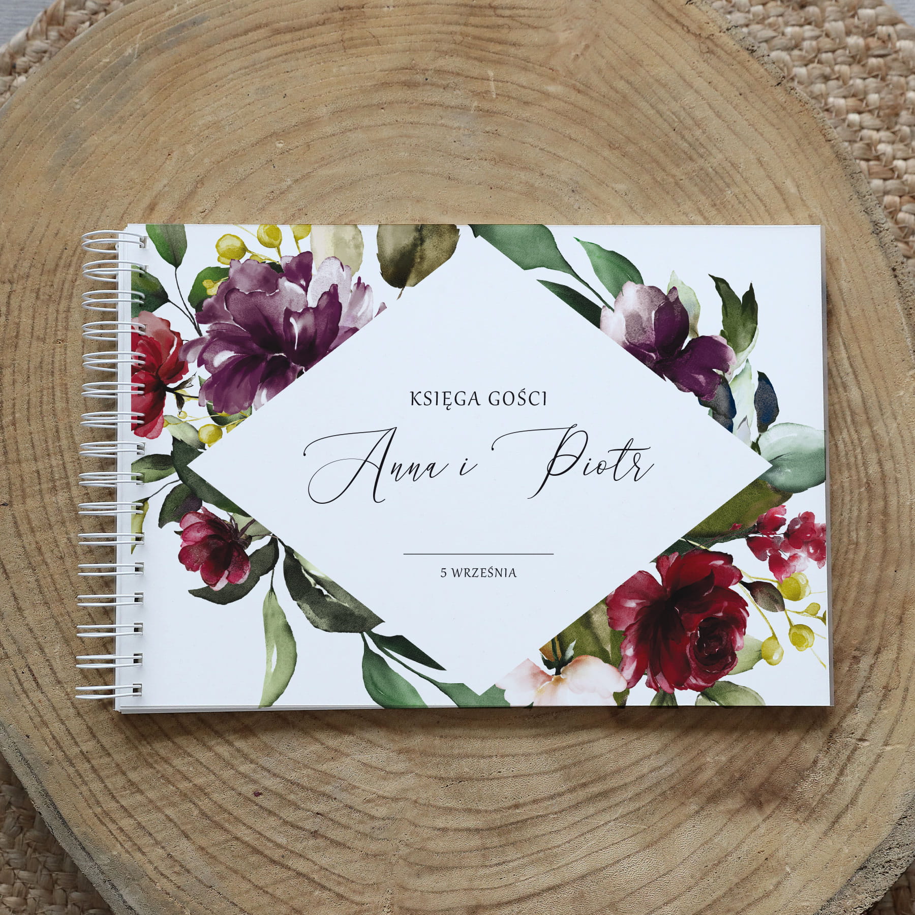 Księga gości klasyczna lub z ankietami - wzór z bordowymi kwiatami boho w wianku
