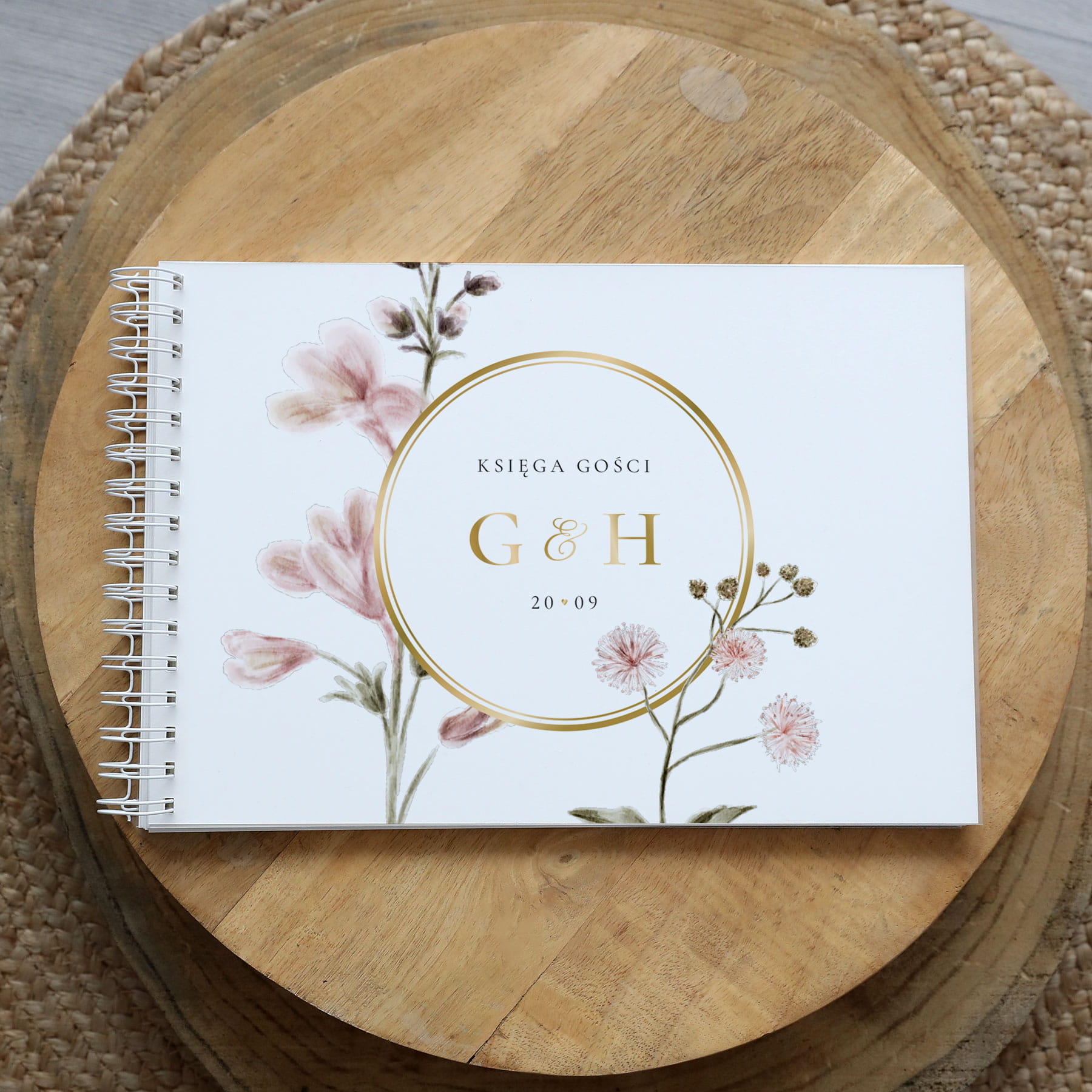 Księga gości klasyczna lub z ankietami - wzór z pastelowymi kwiatami i złotem
