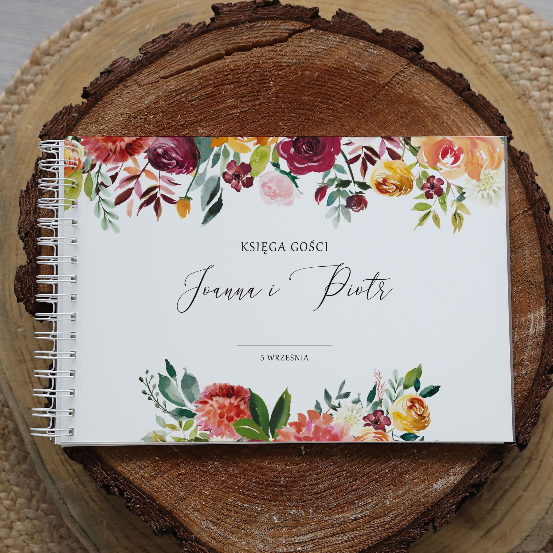 Księga gości klasyczna lub z ankietami - wzór z pomarańczowymi kwiatami boho