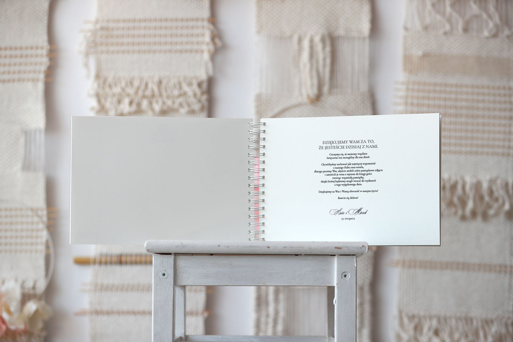 Dzięki oprawie spiralowanej do księgi zmieszczą się nie tylko wpisy, goście śmiało mogą wklejać fotografie, czy zdjęcia z fotobudki.