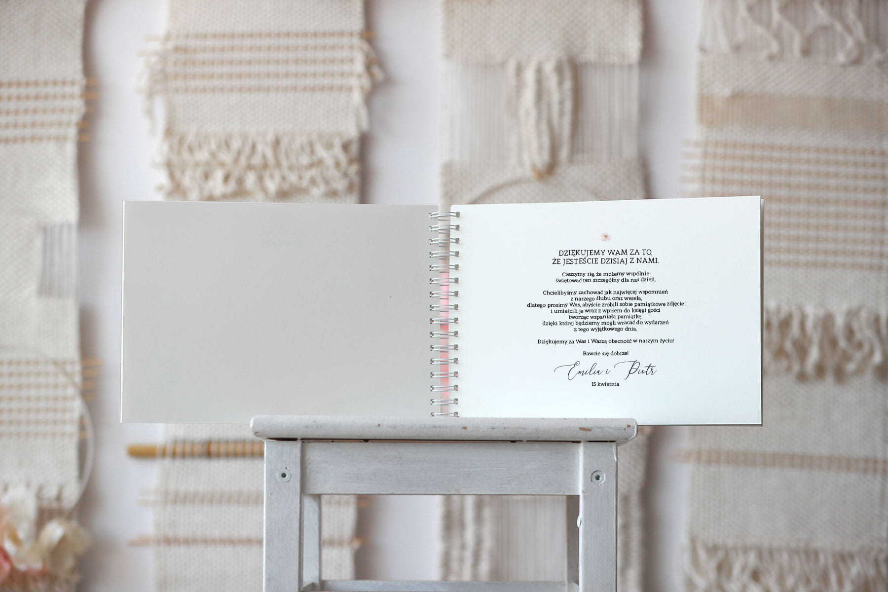 Dzięki oprawie spiralowanej do księgi zmieszczą się nie tylko wpisy, goście śmiało mogą wklejać fotografie, czy zdjęcia z fotobudki.