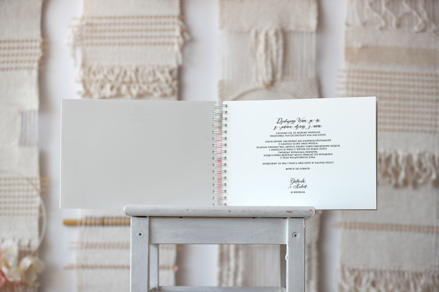Dzięki oprawie spiralowanej do księgi zmieszczą się nie tylko wpisy, goście śmiało mogą wklejać fotografie, czy zdjęcia z fotobudki.