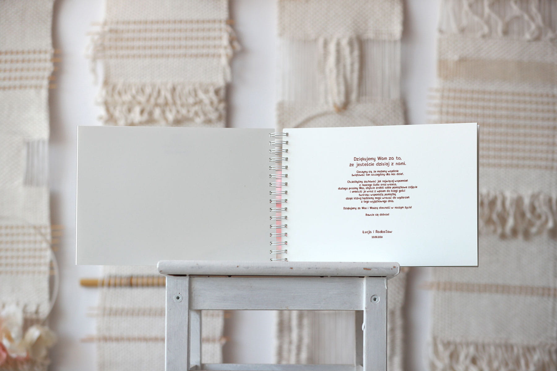 Dzięki oprawie spiralowanej do księgi zmieszczą się nie tylko wpisy, goście śmiało mogą wklejać fotografie, czy zdjęcia z fotobudki.