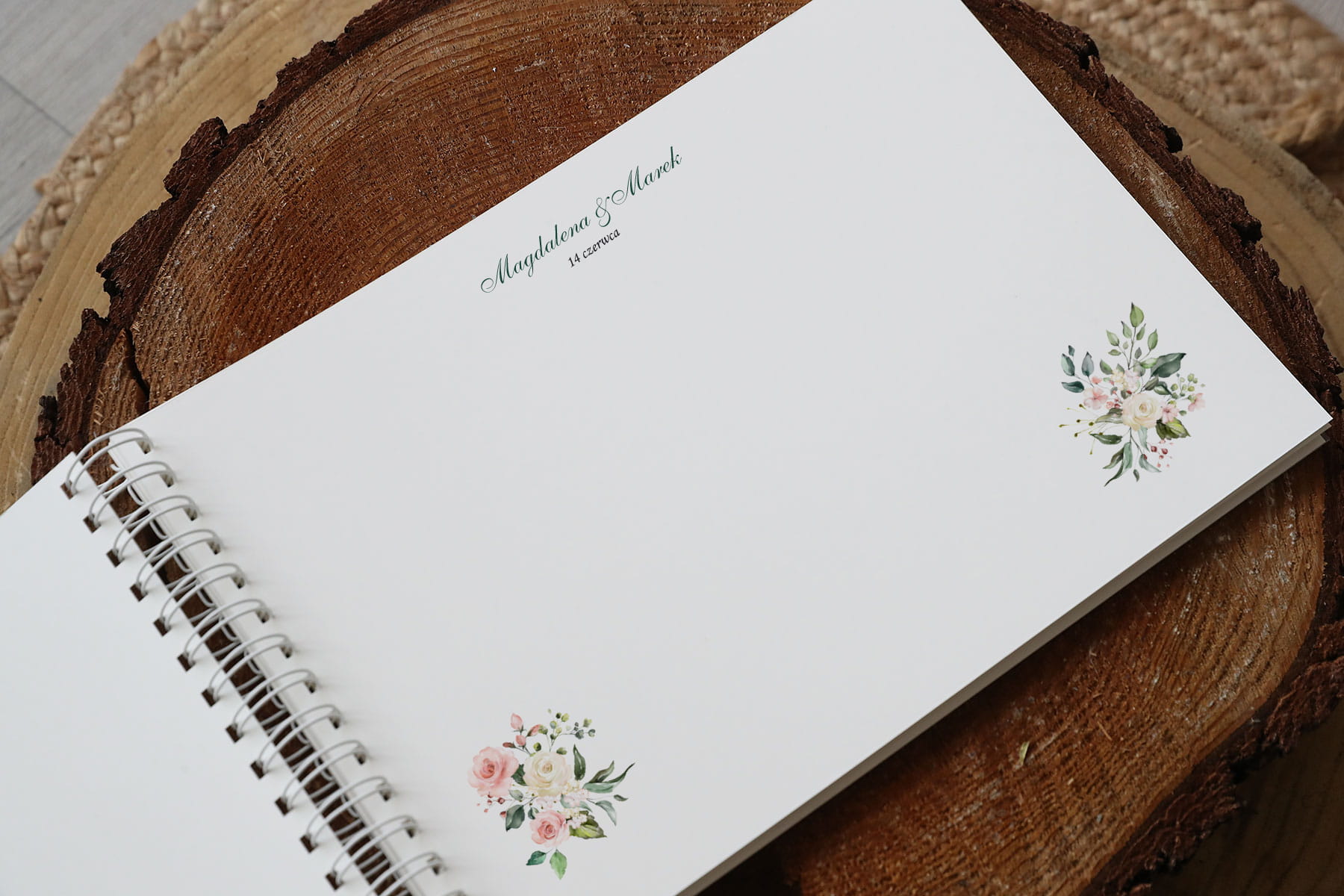 Dzięki oprawie spiralowanej do księgi zmieszczą się nie tylko wpisy, goście śmiało mogą wklejać fotografie, czy zdjęcia z fotobudki.