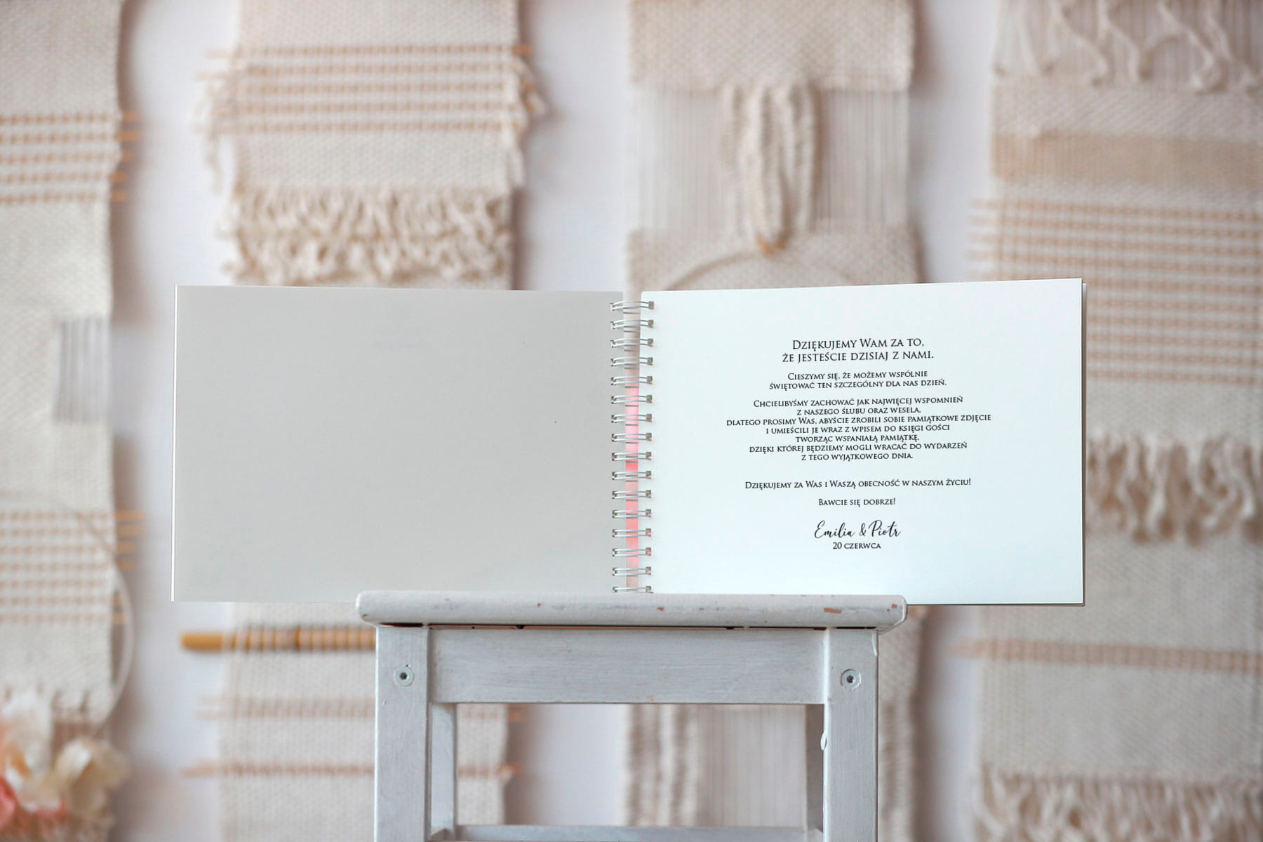 Dzięki oprawie spiralowanej do księgi zmieszczą się nie tylko wpisy, goście śmiało mogą wklejać fotografie, czy zdjęcia z fotobudki.