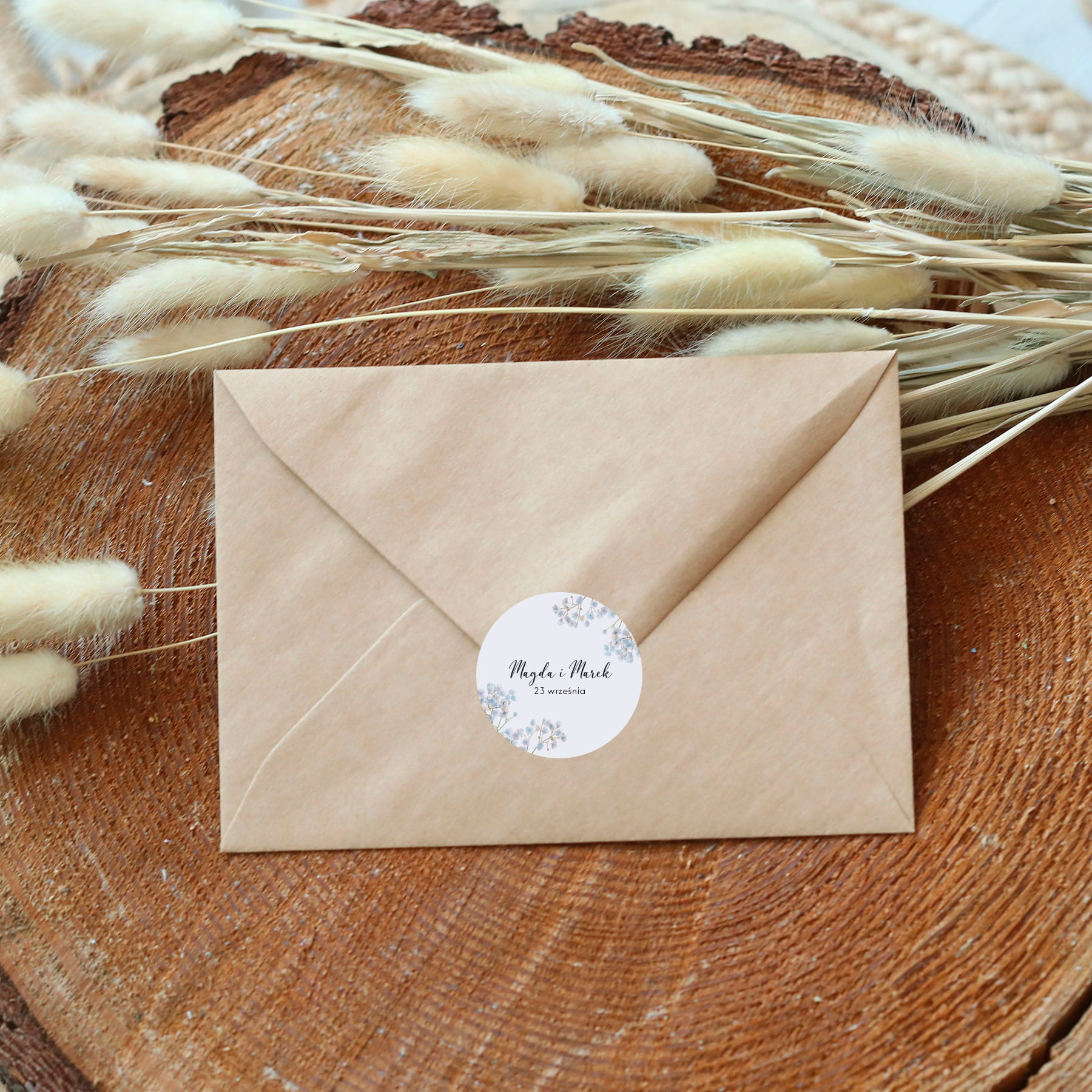 Naklejki ślubne z niebieską gipsówką
