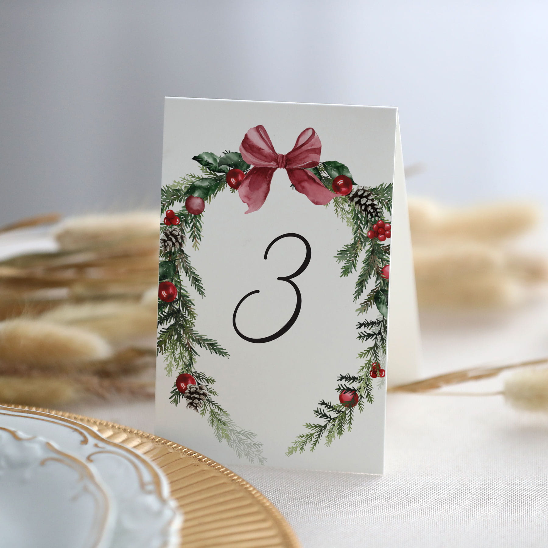 Spójna grafika na planu stołów, numerków i winietek pięknie dopełnia dekorację przyjęcia.