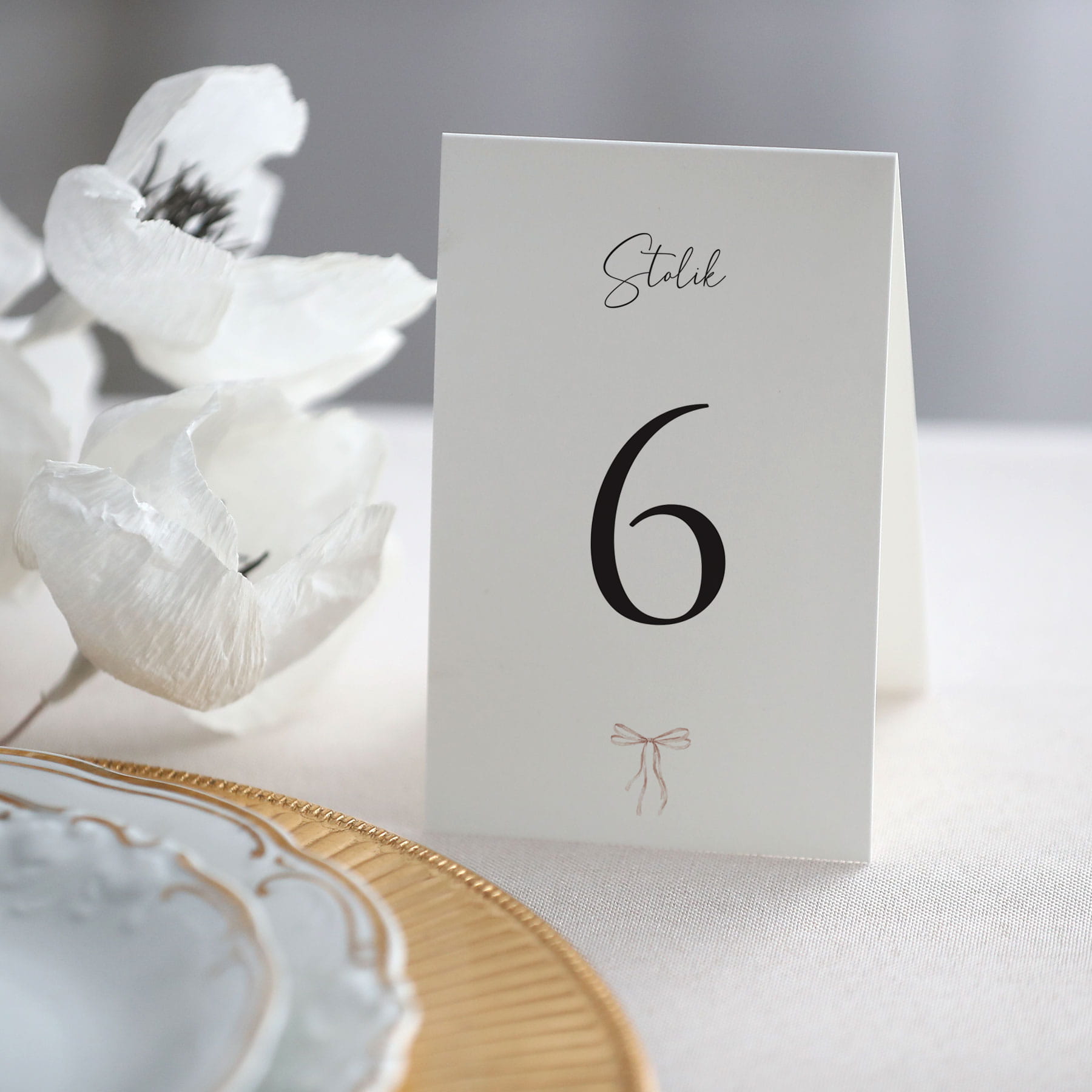 Numerek stołu na przyjęcie z beżową wstążeczką