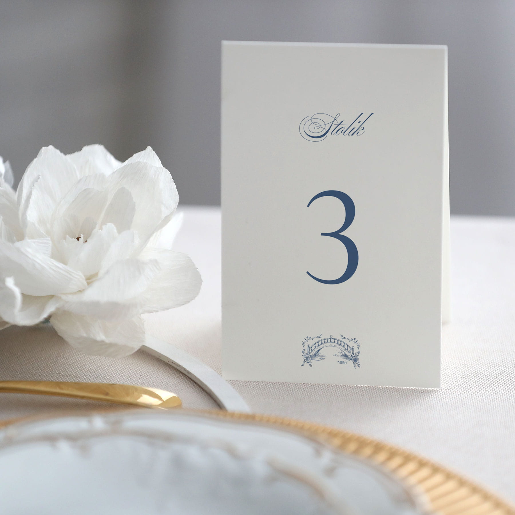 Numerek stołu na przyjęcie z granatowym mostem