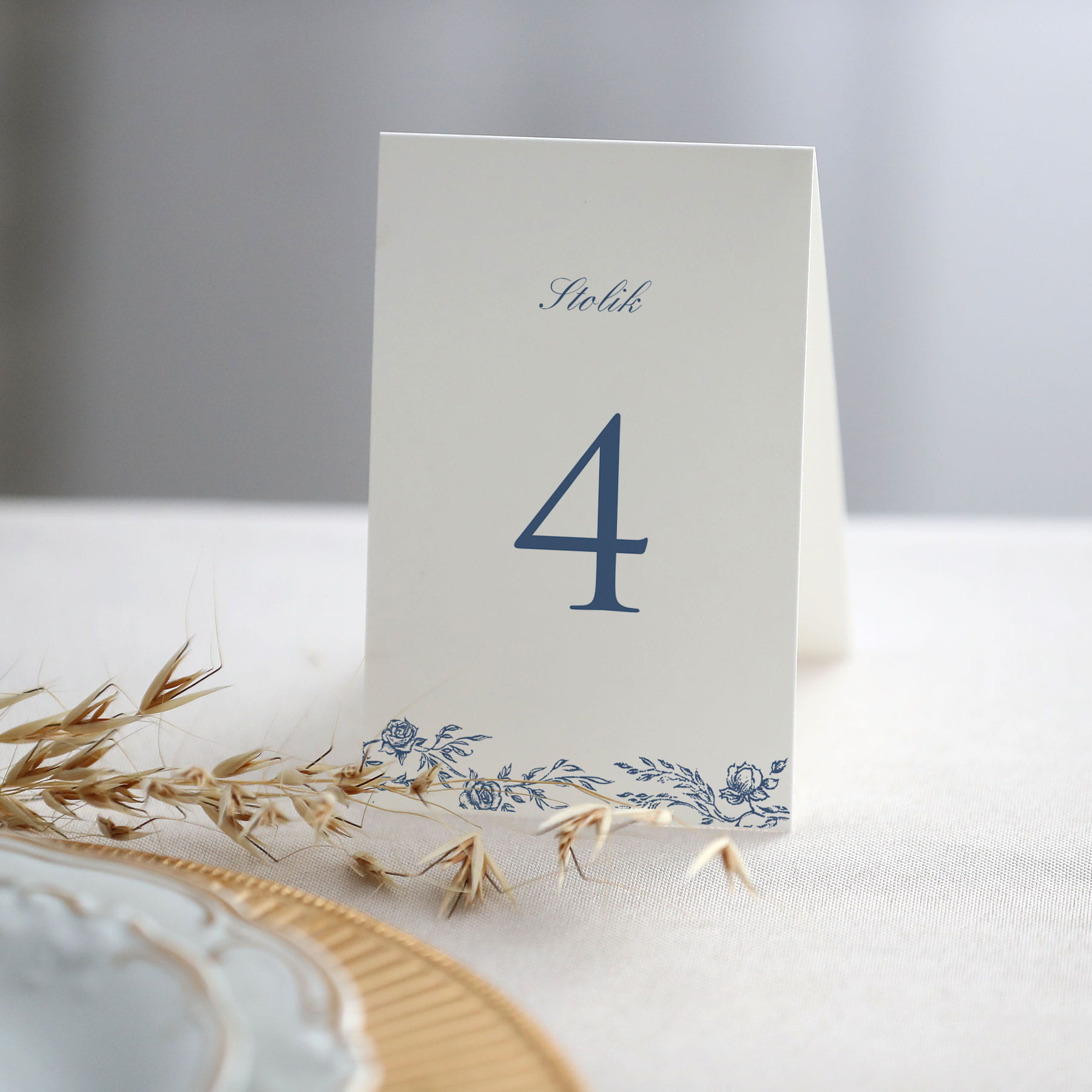 Numerek stołu na przyjęcie z klasycznym granatowym motywem