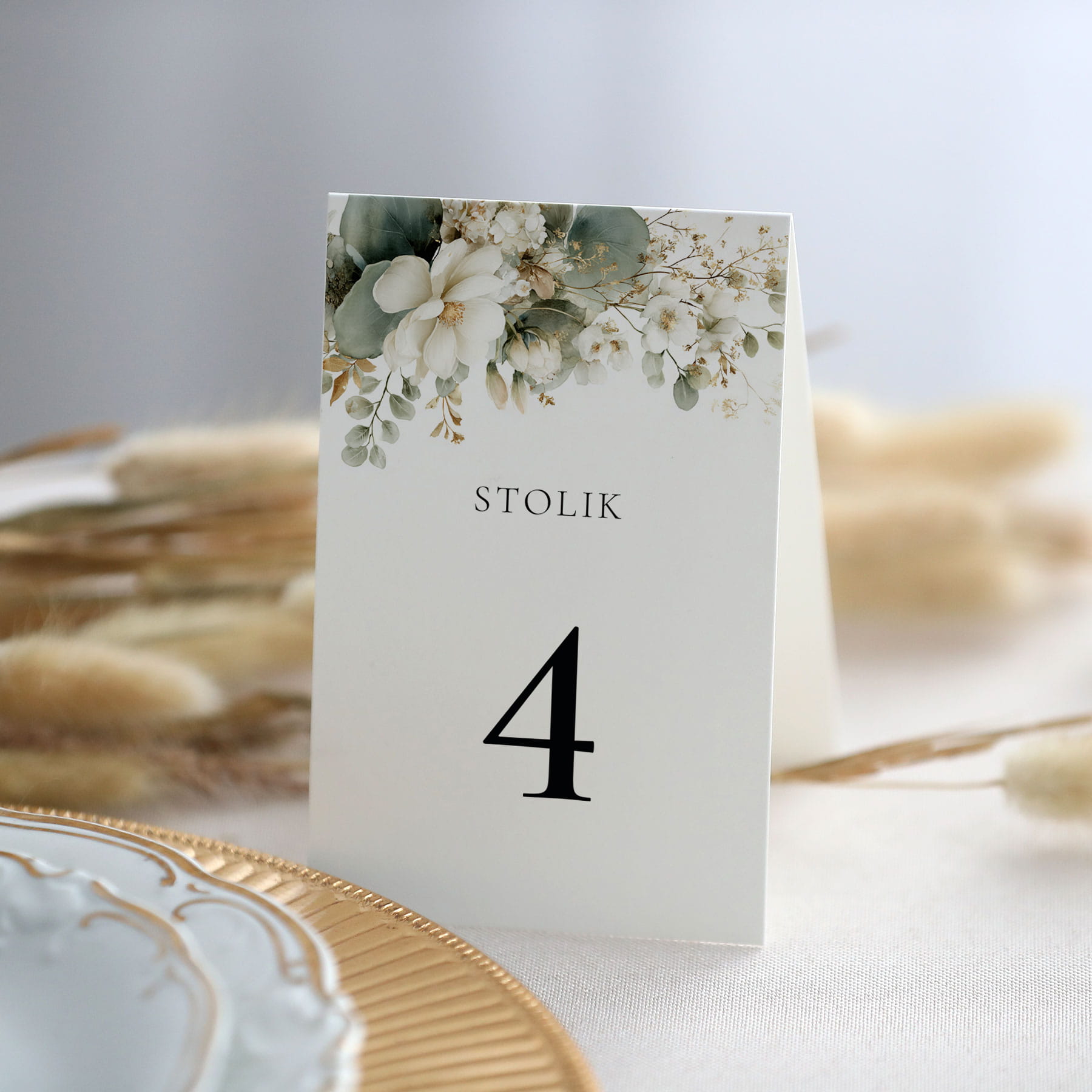 Numerek stołu na przyjęcie z kompozycją z eukaliptusa