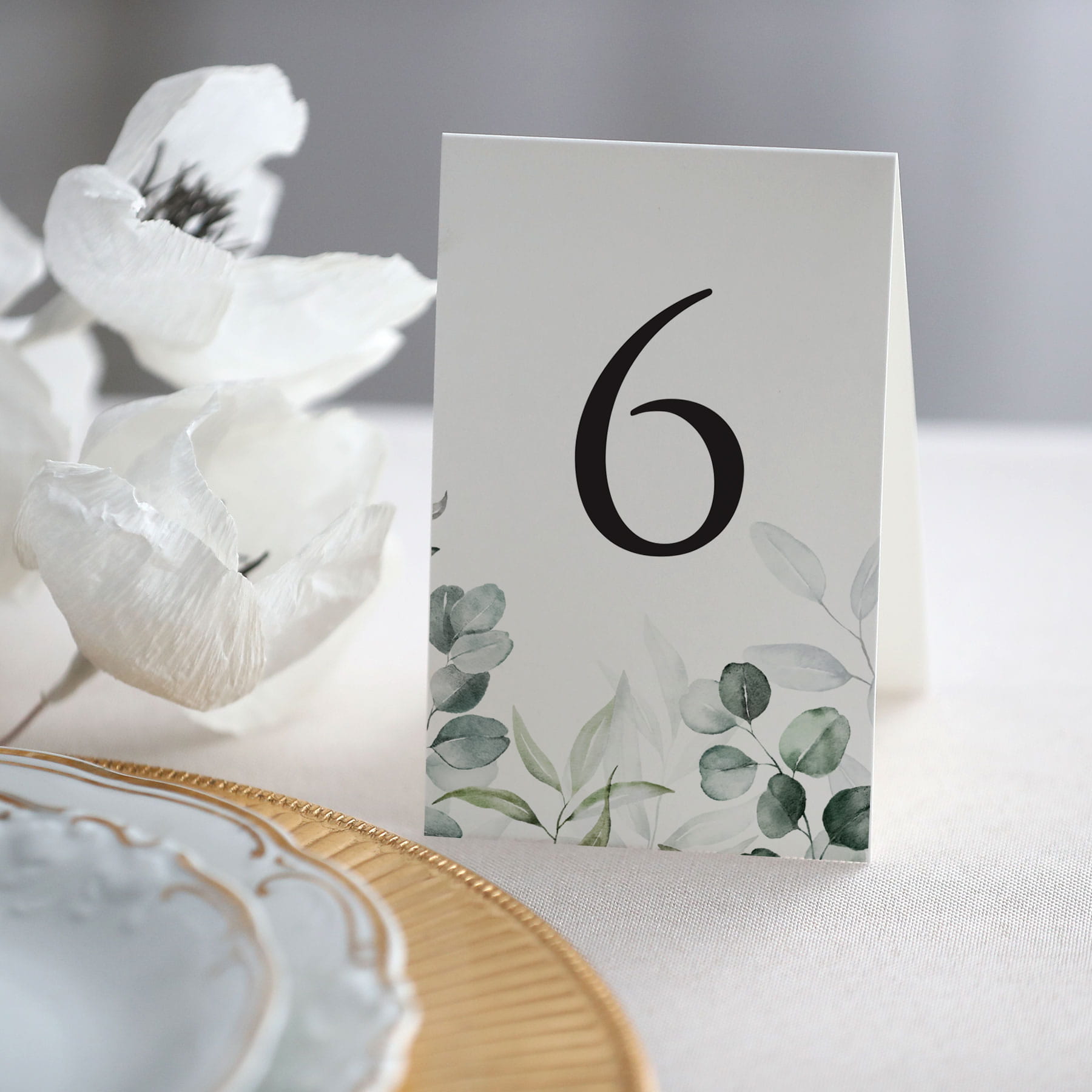 Numerek stołu na przyjęcie z listkami eukaliptusa