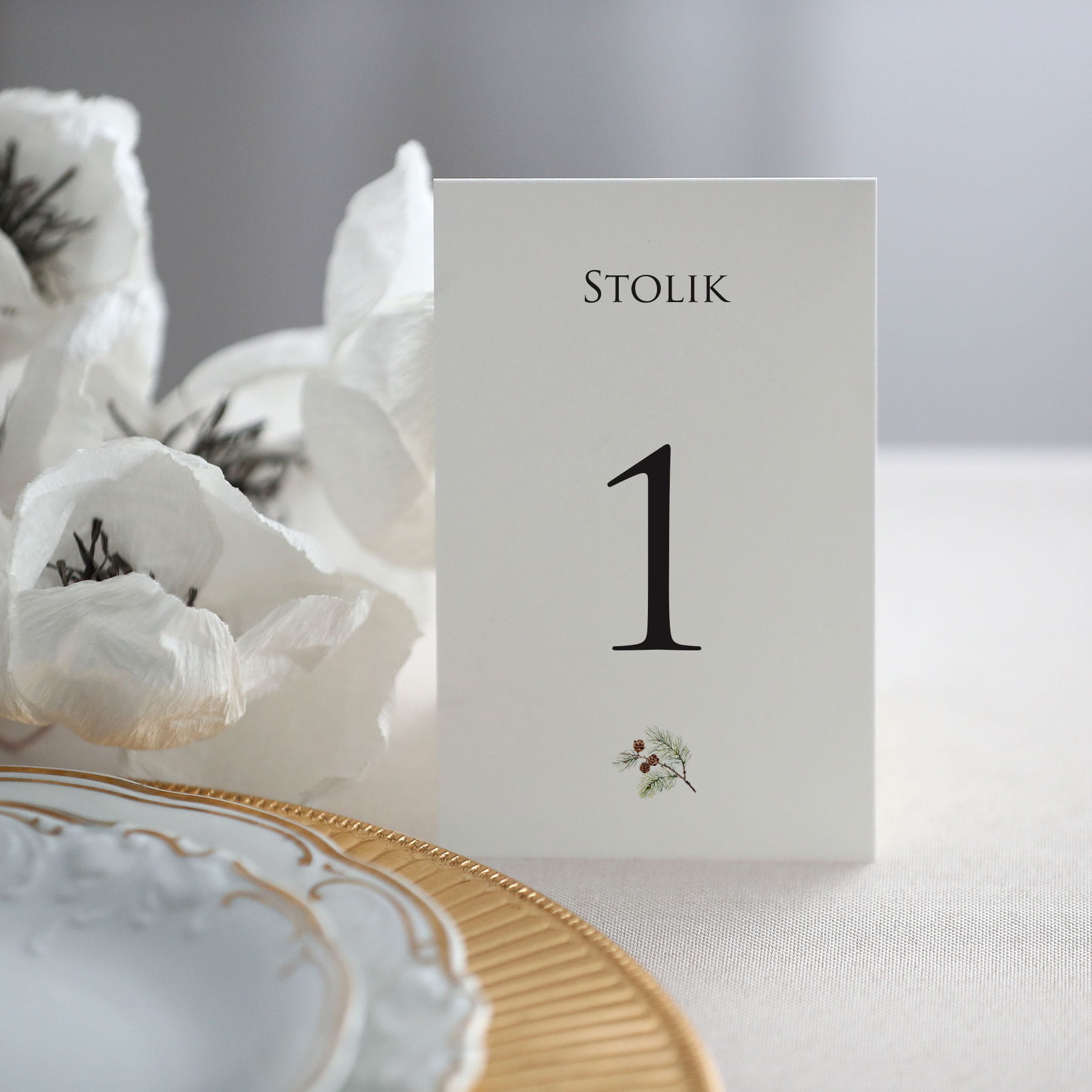 Spójna grafika na planu stołów, numerków i winietek pięknie dopełnia dekorację przyjęcia.
