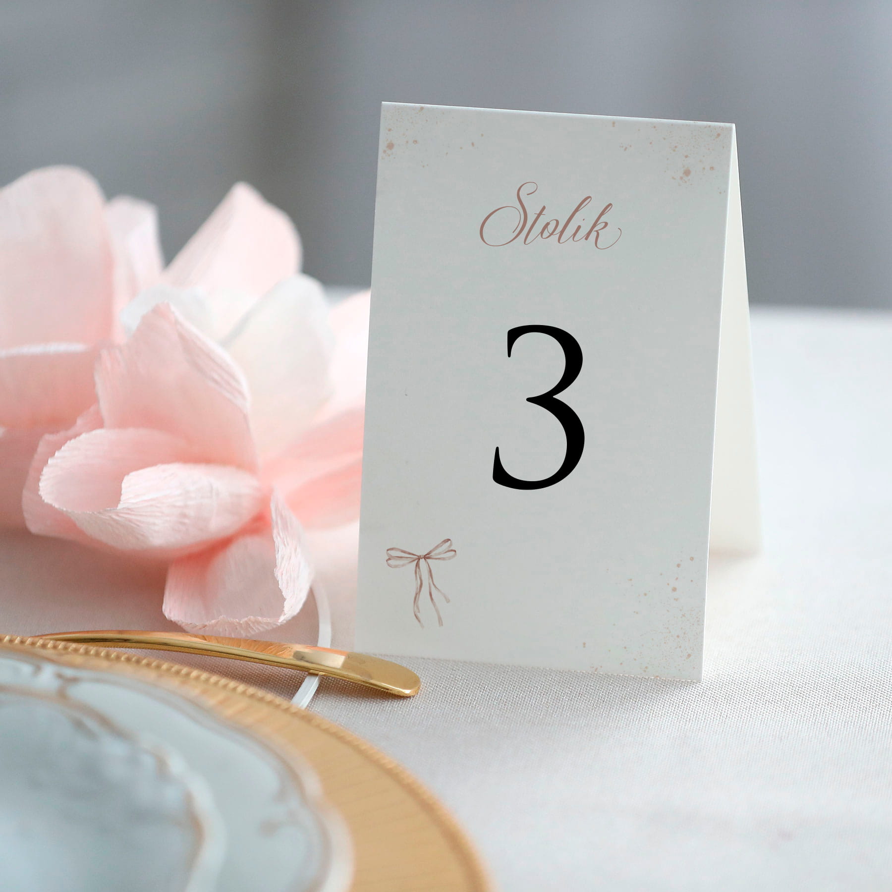 Spójna grafika na planu stołów, numerków i winietek pięknie dopełnia dekorację przyjęcia.