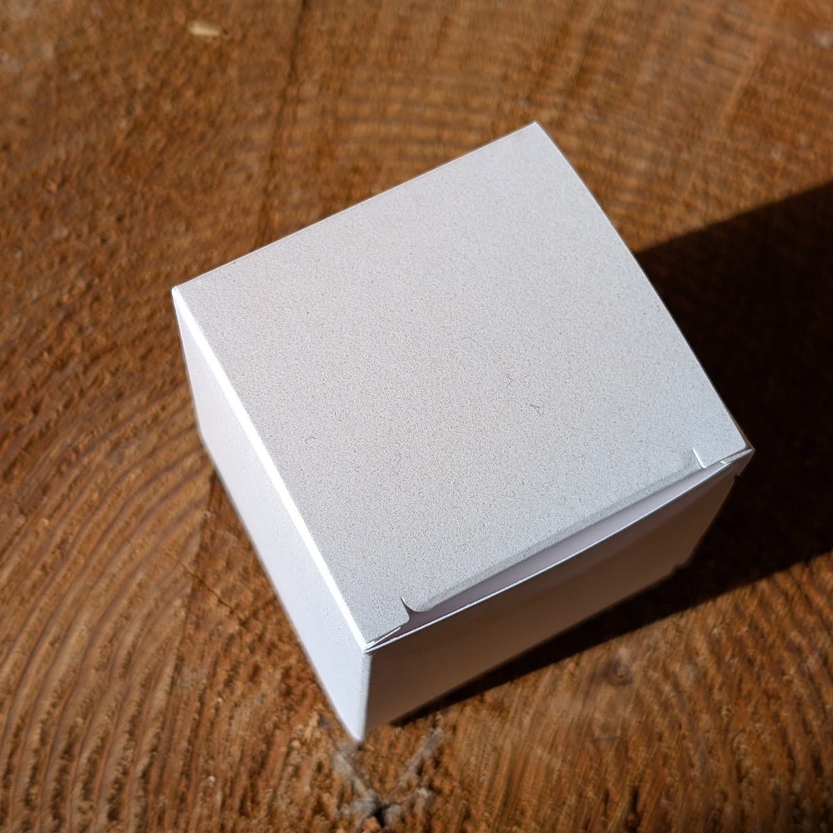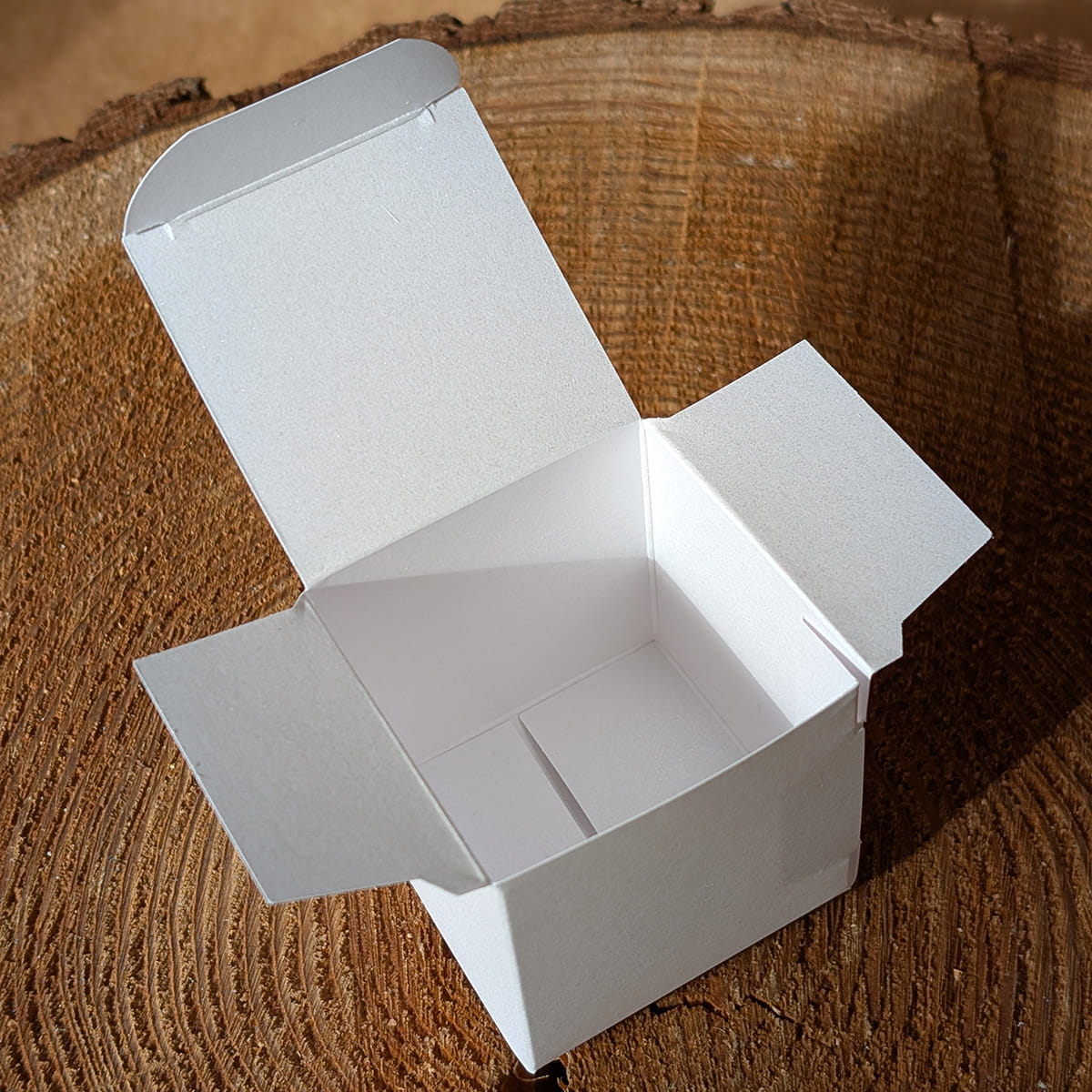Małe pudełeczka - 5x5x5 cm z białego perłowego papieru do samodzielnego złożenia.