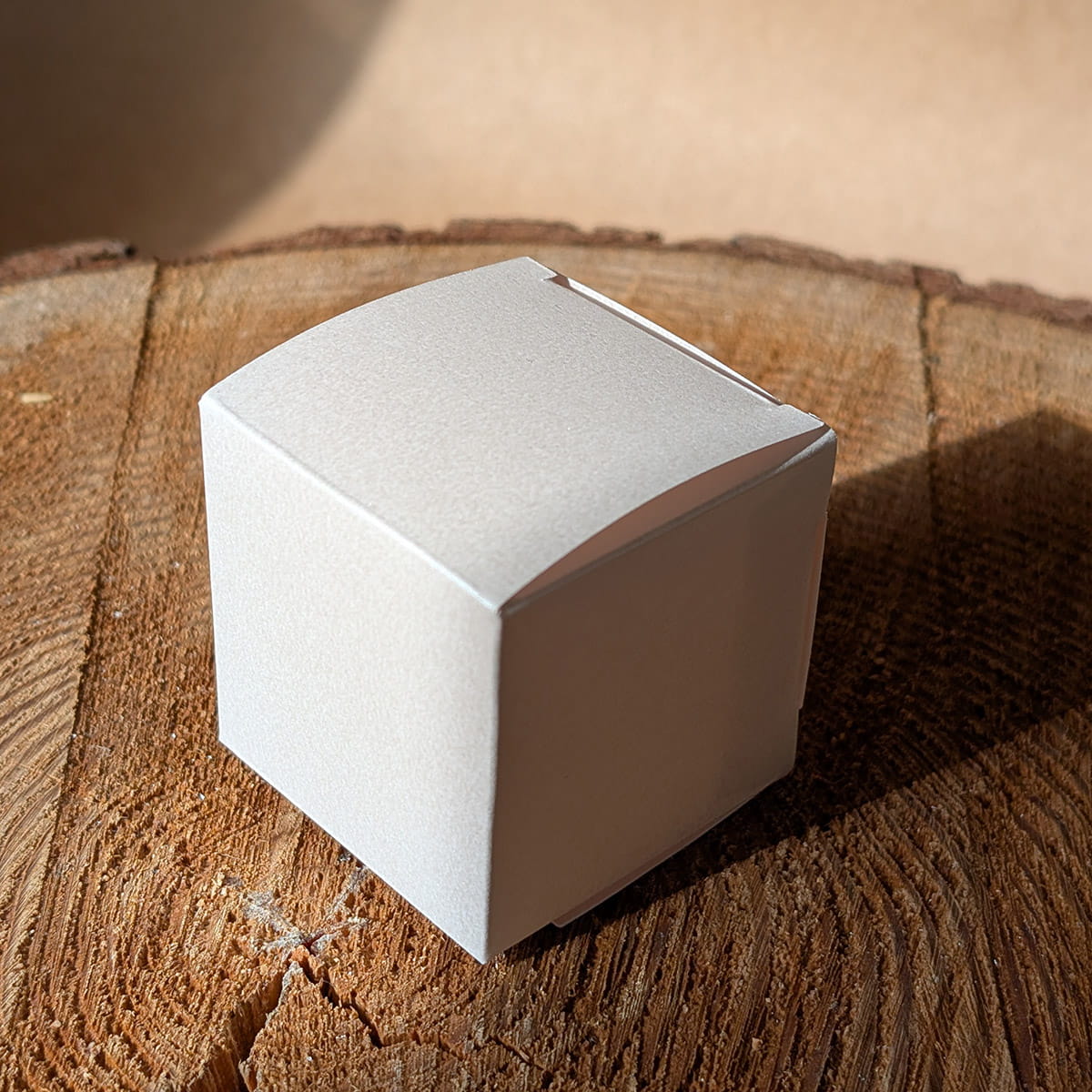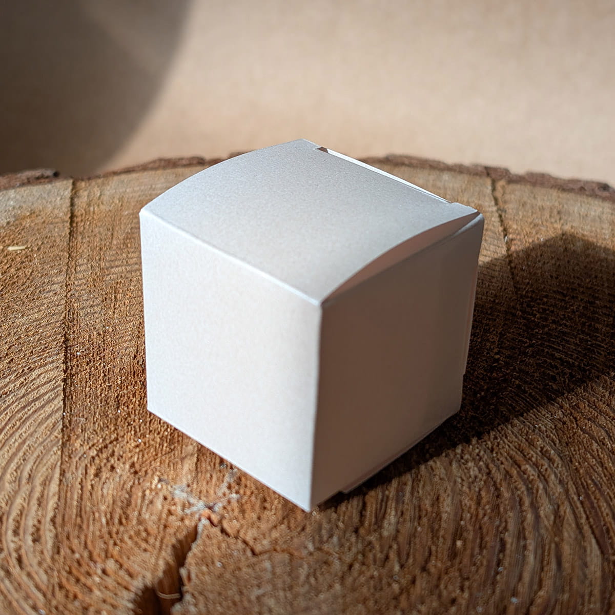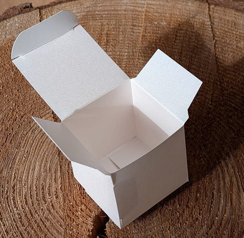 Małe pudełeczka - 5x5x5 cm z perłowego papieru ecru do samodzielnego złożenia.