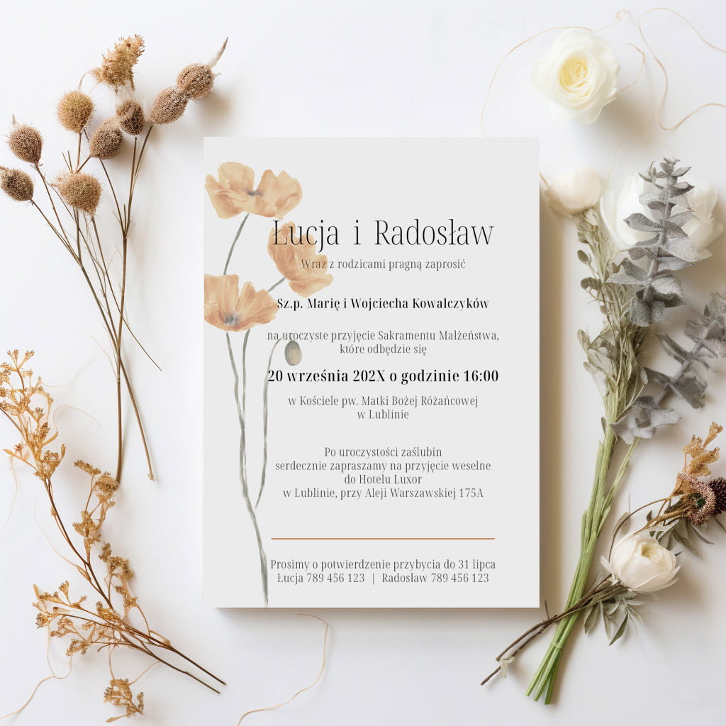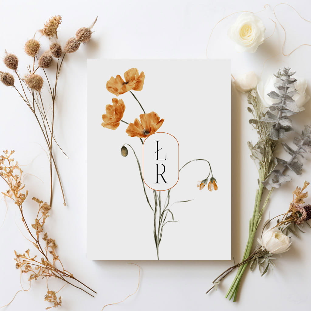 Styl zaproszenia jest romantyczny i elegancki, z akwarelowymi motywami kwiatowymi w ciepłych, jesiennych odcieniach oraz minimalistyczną, nowoczesną typografią.