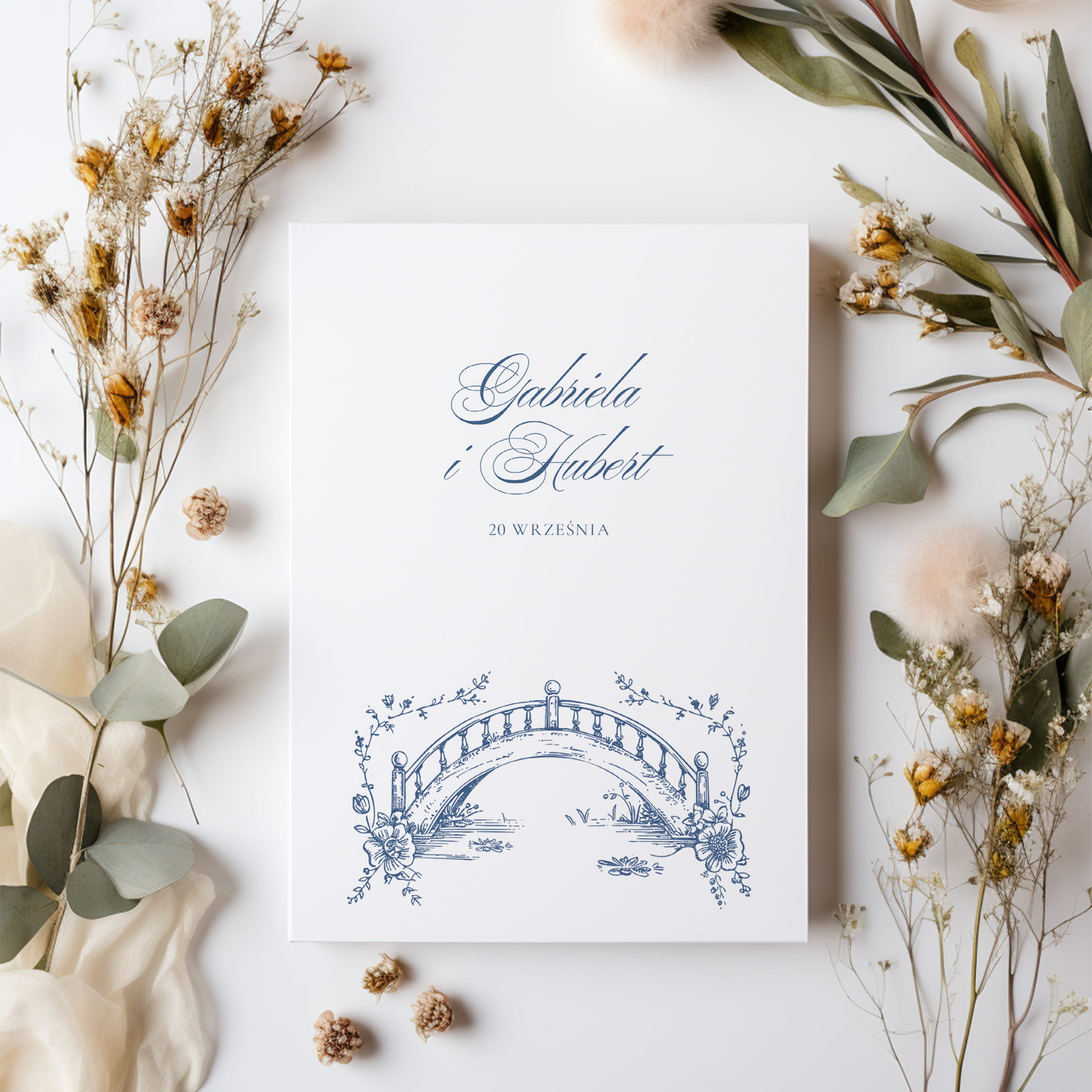 To zaproszenie ślubne ozdobione jest u dołu eleganckim, niebieskim rysunkiem stylizowanego mostu otoczonego motywami florystycznymi.
