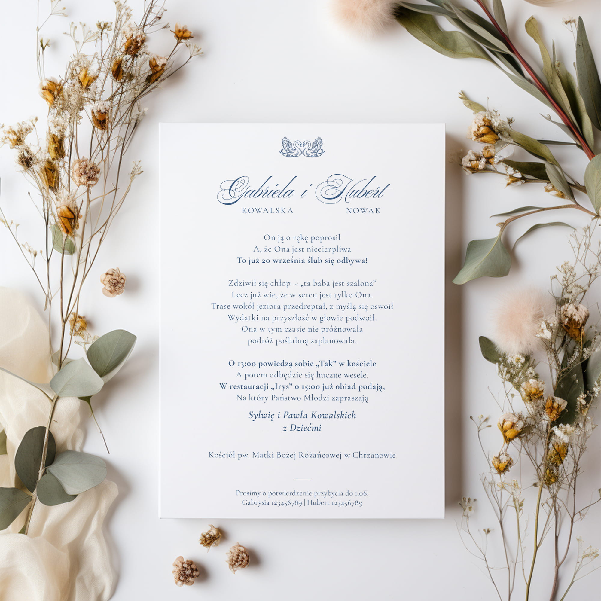 Dołącz do zamówienia treść zaproszenia uzupełnioną o wasze dane, miejsce ślubu i przyjęcia, telefonami z imionami do potwierdzenia, oraz wybrane cytaty i rebusy.