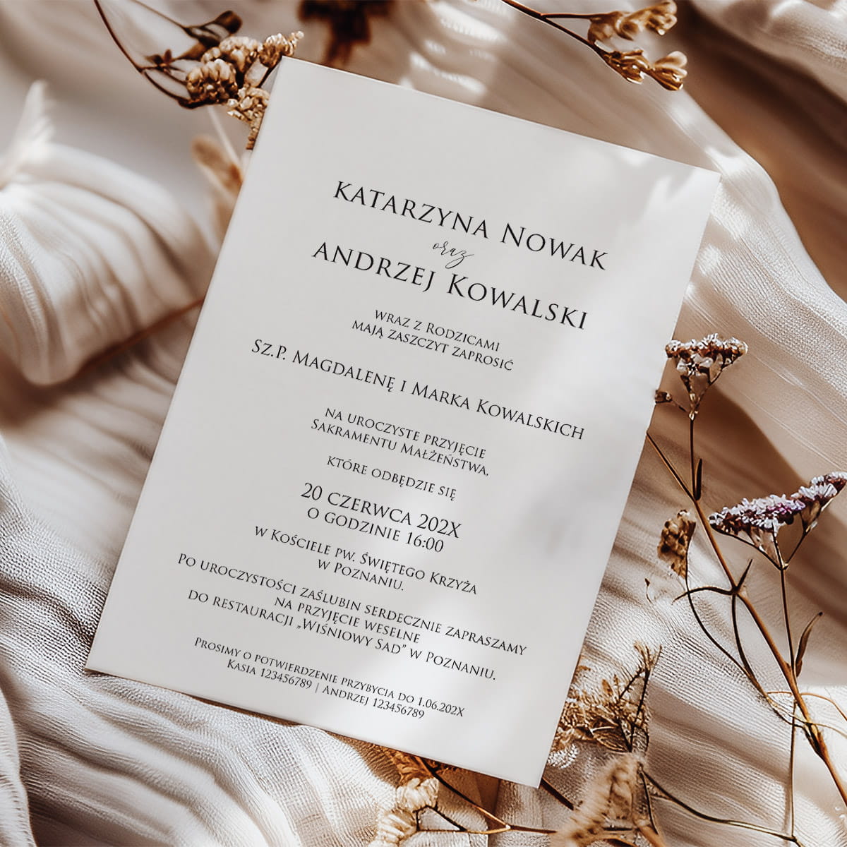Dołącz do zamówienia treść zaproszenia uzupełnioną o wasze dane, miejsce ślubu i przyjęcia, telefonami z imionami do potwierdzenia, oraz wybrane cytaty i rebusy.