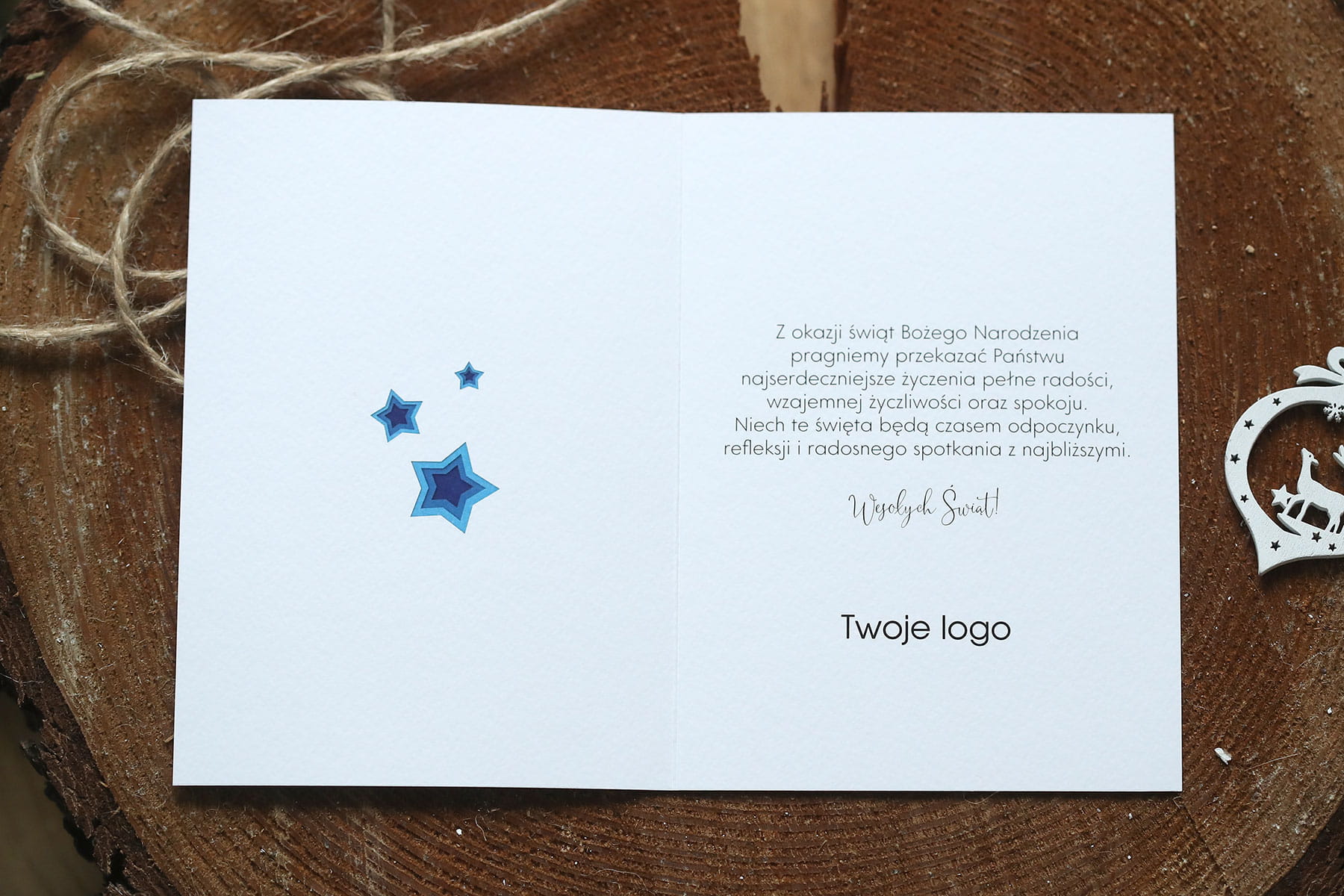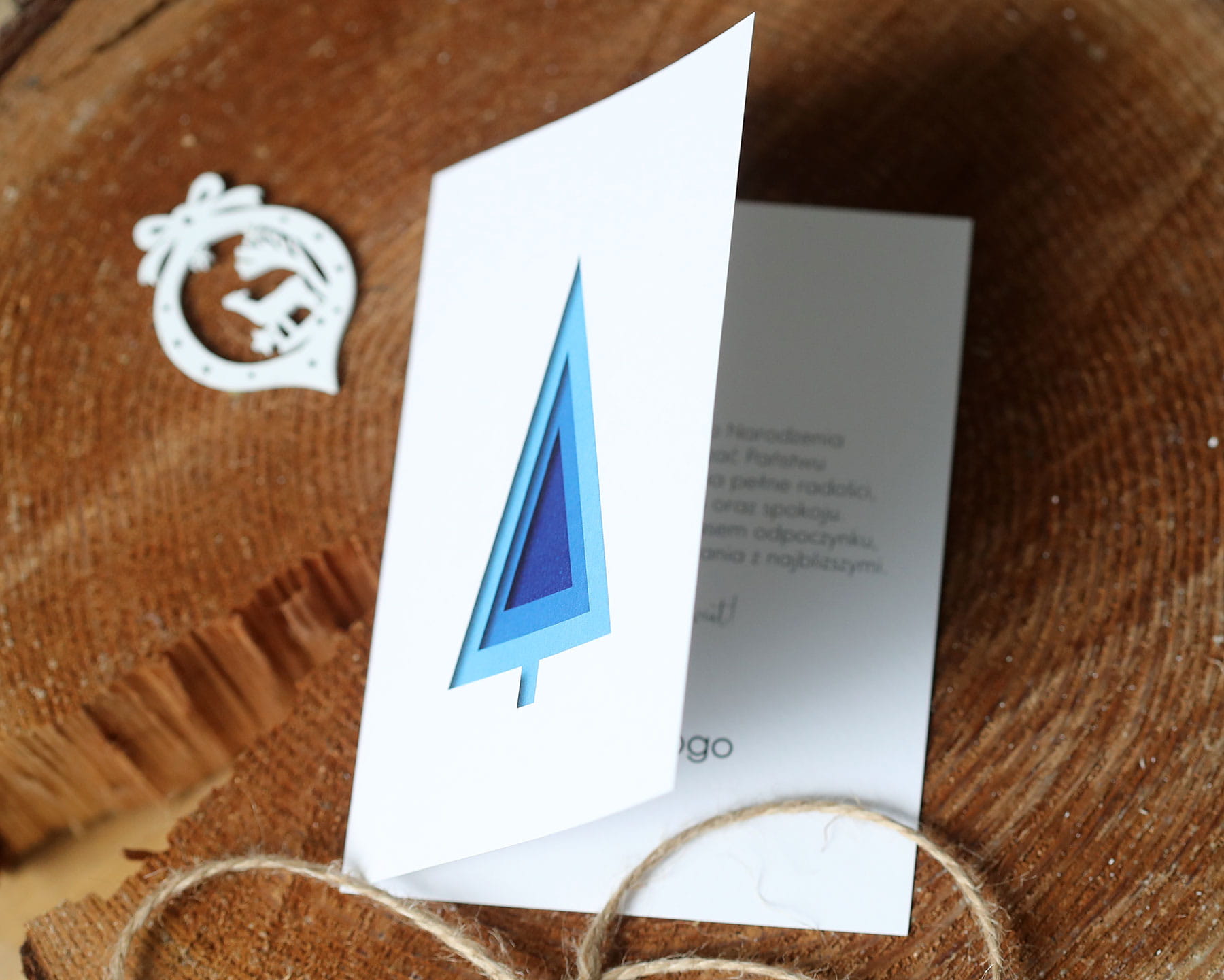 Kartka firmowa świąteczno-noworoczna z niebieską choinką z efektem wyciętego papieru